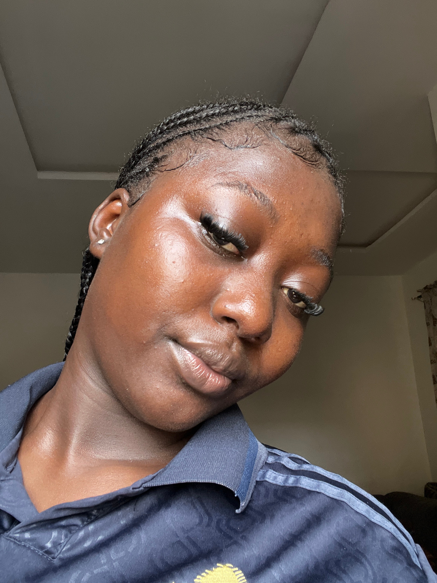 A close-up photograph depicts a woman with dark skin and small braids framing her face. She wears false eyelashes and her skin appears shiny, possibly due to makeup or natural oils. She is dressed in…read more