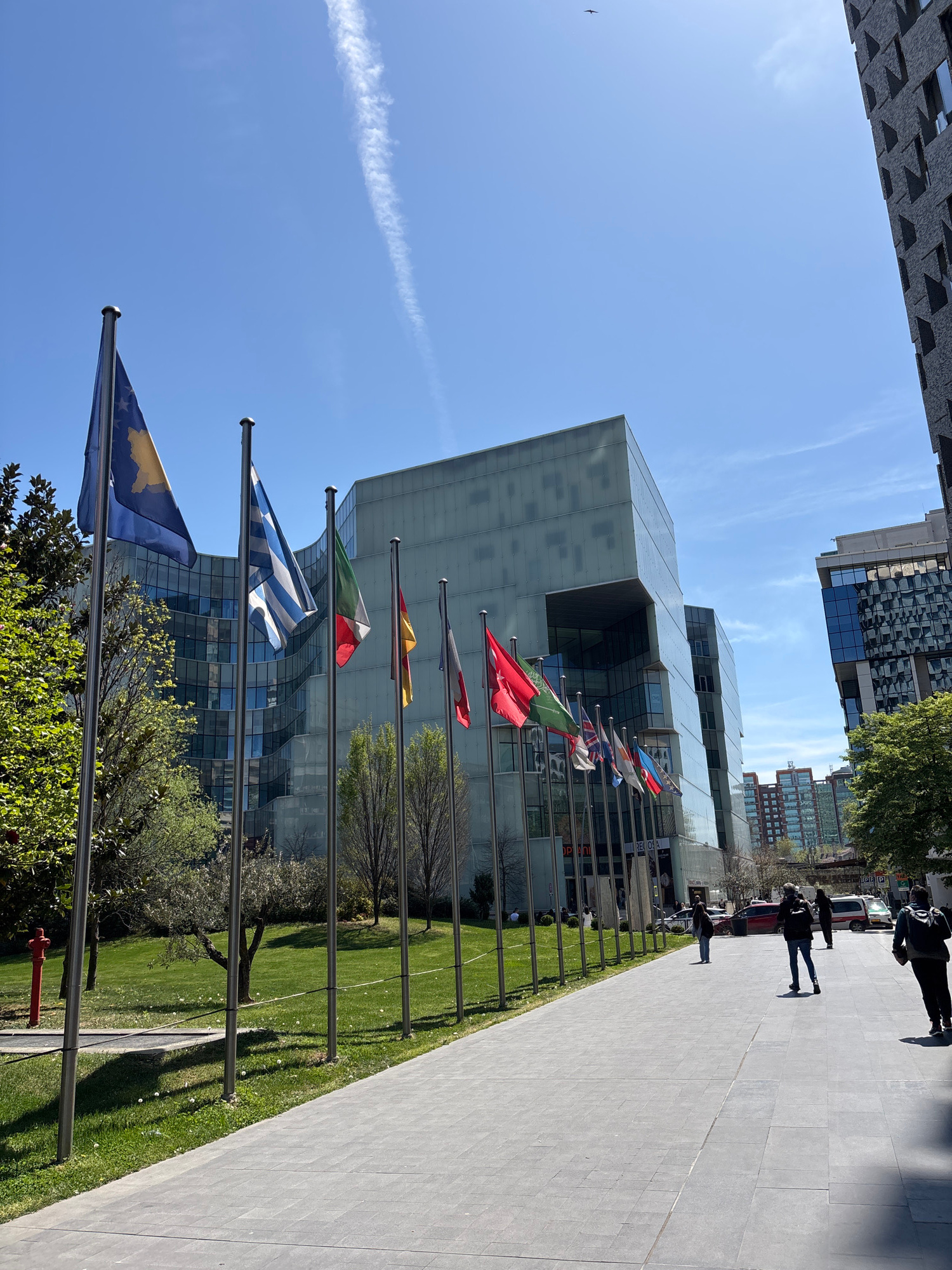 The image depicts the facade of a modern glass building with multiple flagpoles displaying various national flags. The building is situated near a sidewalk where several people are walking. The locatβ¦read more