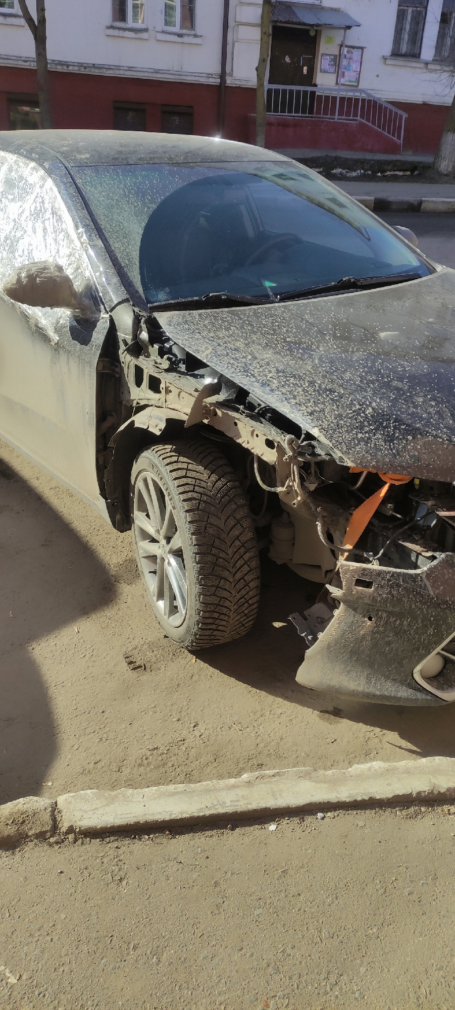The image depicts a severely damaged dark-colored car, likely in Fryazino, Russia, given the surrounding architecture visible through the windshield. The front of the car is extensively wrecked, with…read more