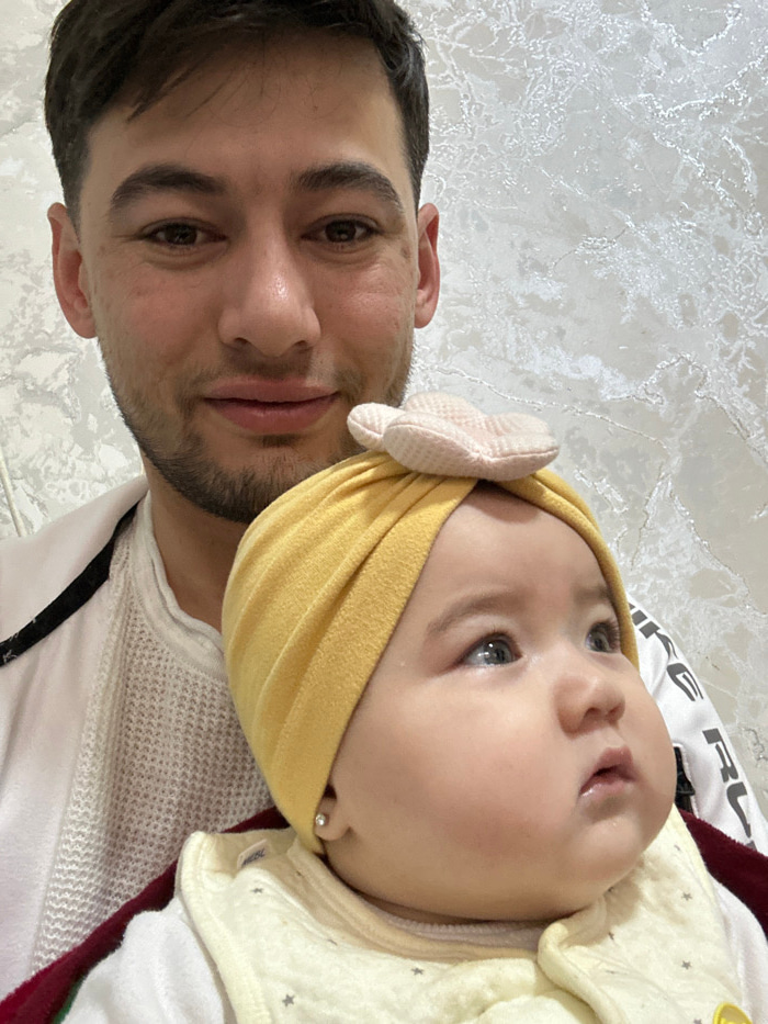 A close-up captures a man and a baby. The man, with dark hair and a trimmed beard, is positioned to the left. The baby, wearing a yellow headband with a cream-colored bow and a light yellow outfit wit…read more
