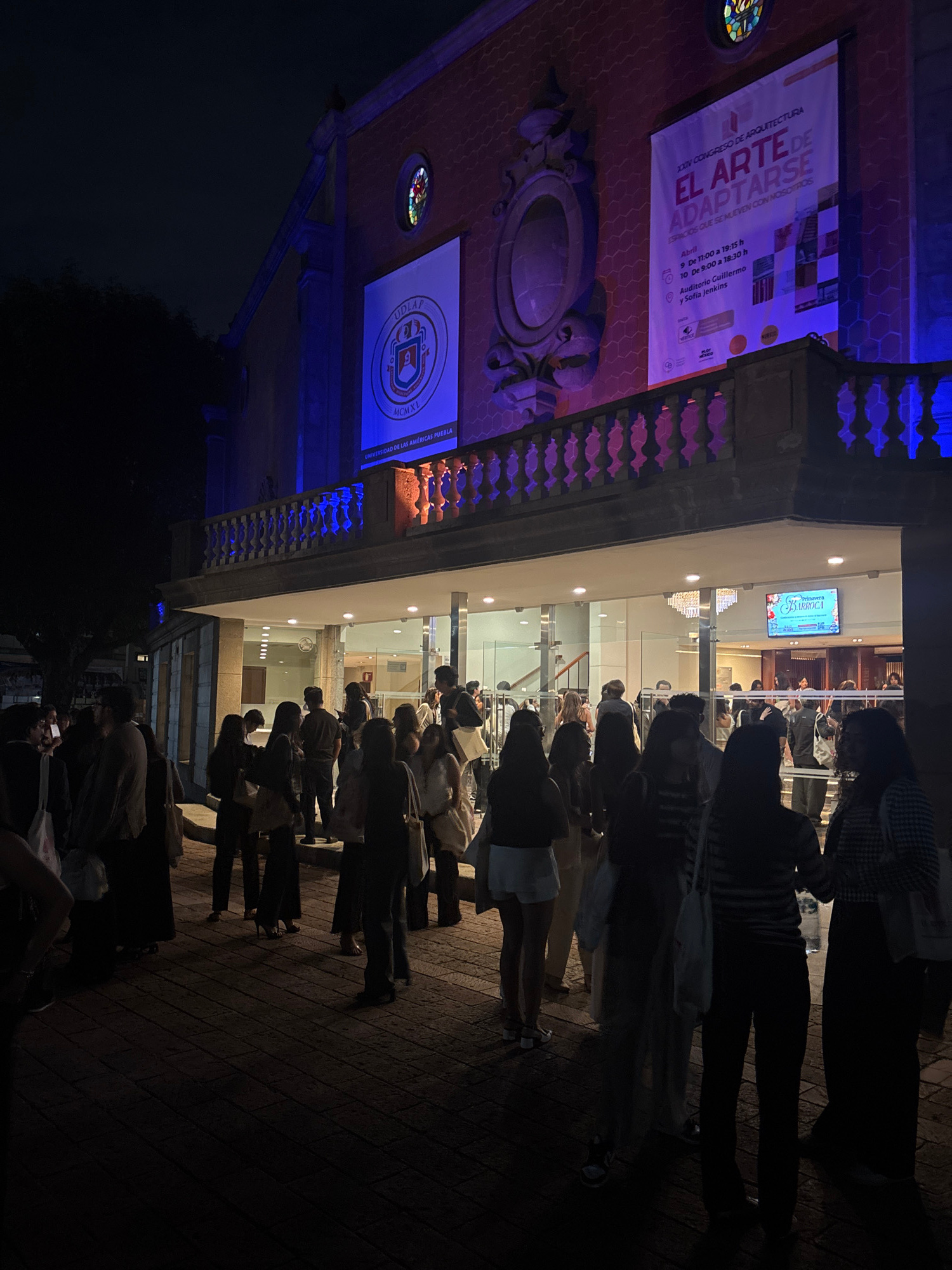The image depicts a nighttime scene in San Andrés Cholula, Mexico, likely in front of a building belonging to the Universidad de las Américas Puebla (UDLAP). A group of people is standing in front of…read more