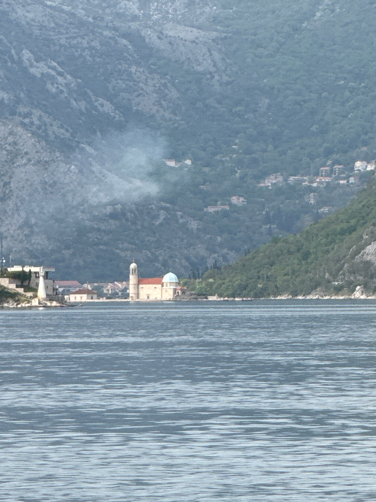 This media file captures a serene landscape in Lepetane, Montenegro, showcasing a bay bordered by a steep, forested mountain. The image is composed of three main horizontal bands when correctly orient…read more