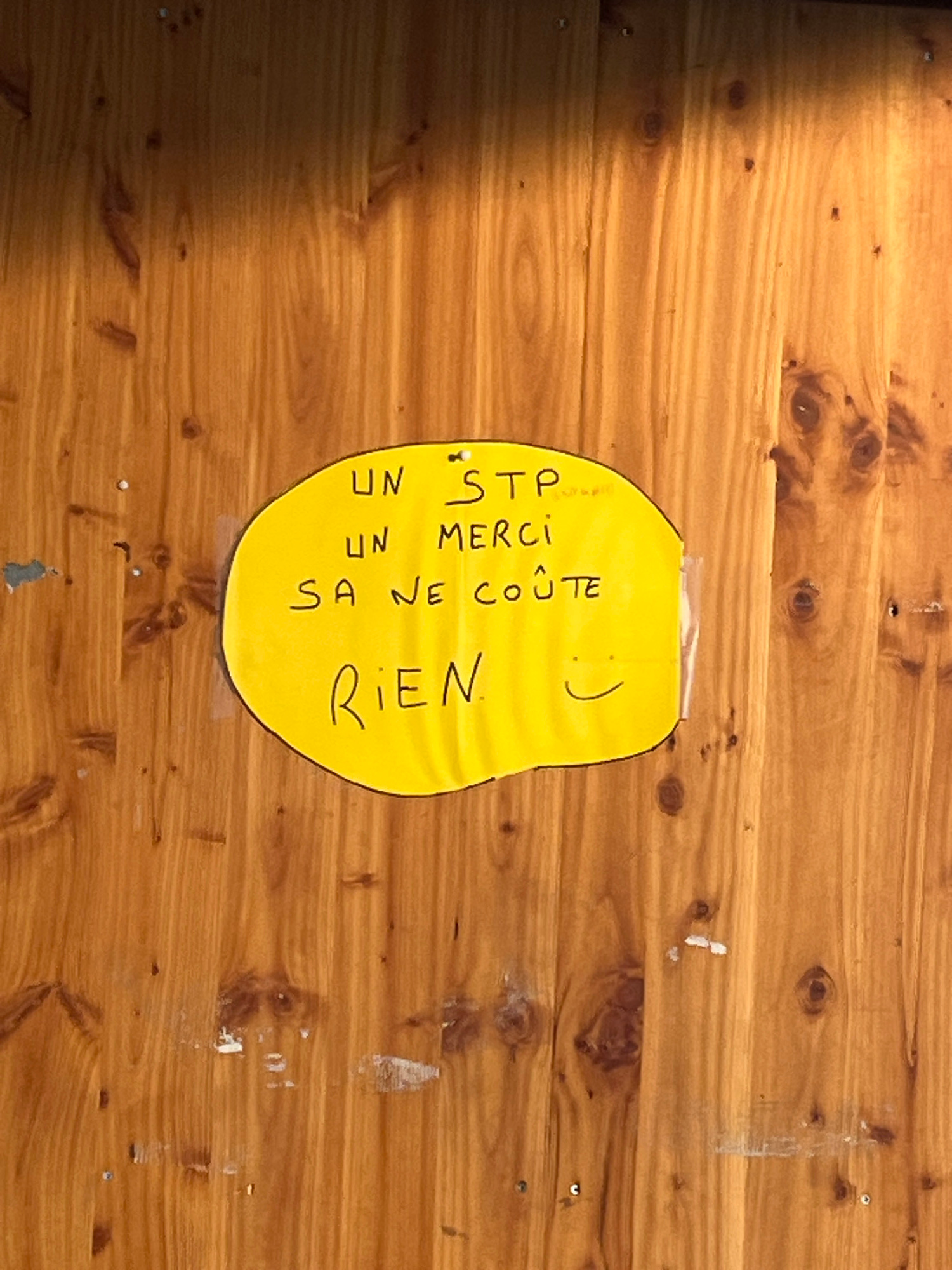 A yellow paper with text in French is taped to a wooden wall. The text reads "UN STP, UN MERCI SA NE COÛTE RIEN :)" (English translation: "A please, a thank you, it costs nothing :)"). The wooden wall…read more