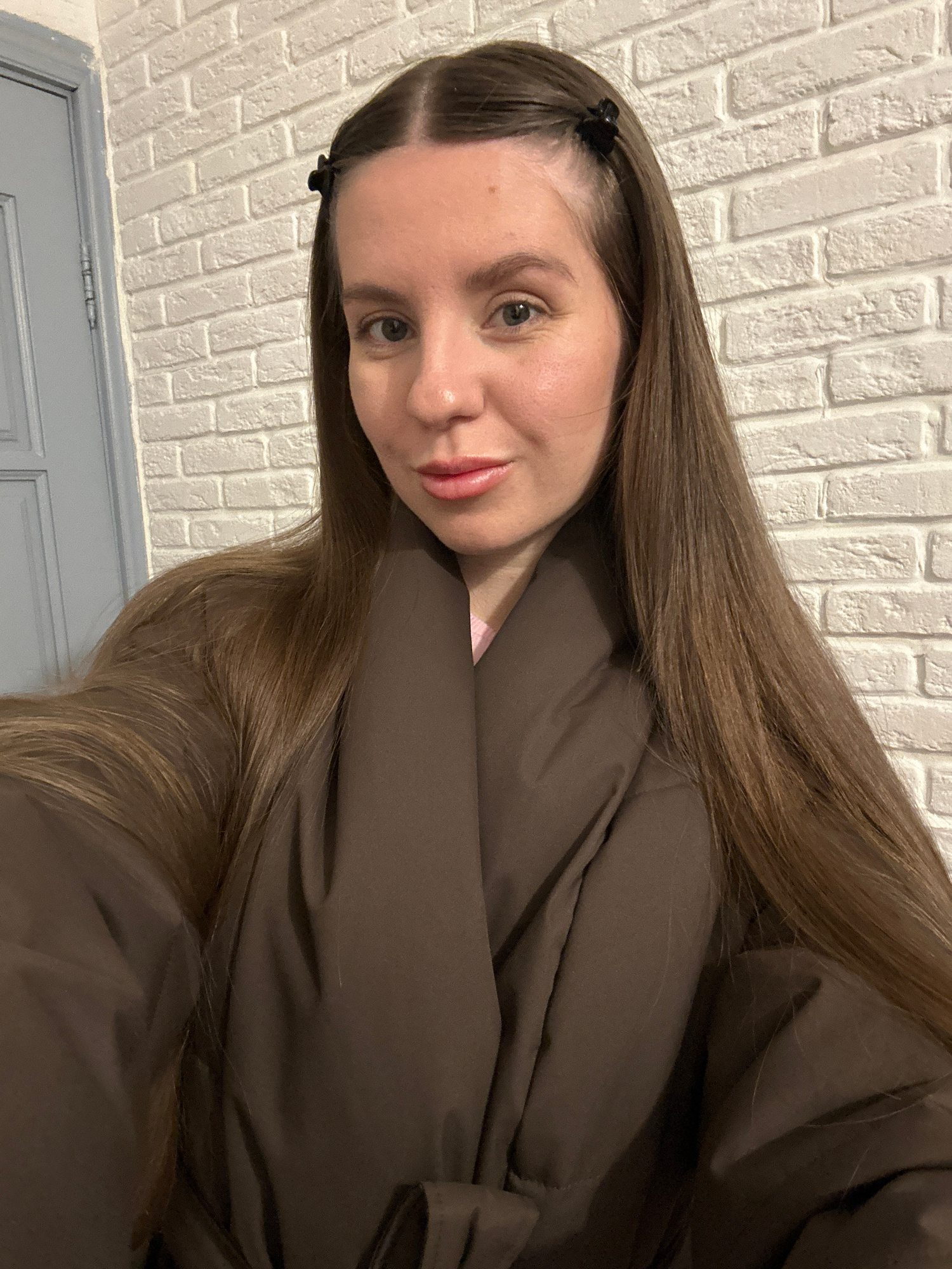 A person with long brown hair and fair skin is looking at the camera with a slight smile. They are wearing a brown garment. A small black hair clip is visible in their hair. The background consists ofโฆread more