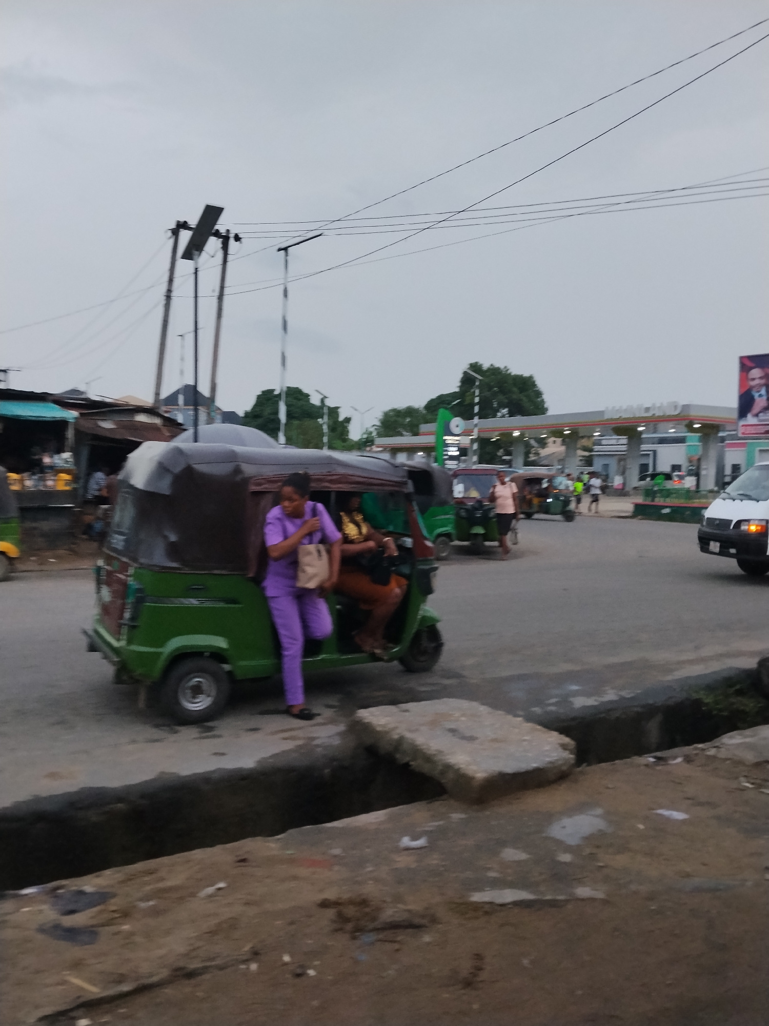 The image shows a street scene in Aba, Nigeria. In the foreground, a green and brown auto-rickshaw (tuk-tuk) is parked on the side of the road. A woman wearing a purple outfit is exiting the vehicle.…read more