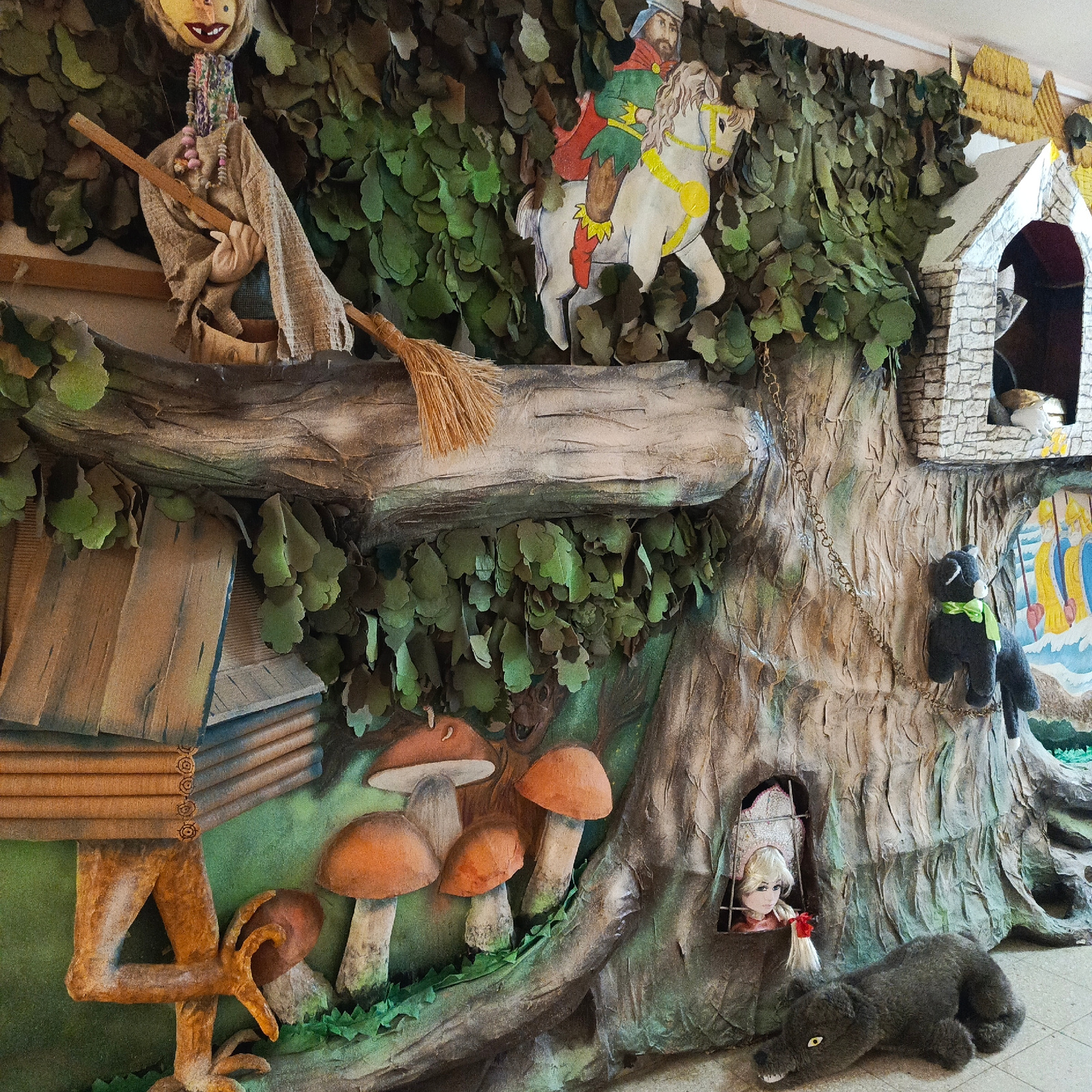 The image shows a scene in Markovskii, Russia, possibly a theatrical stage set or children's exhibit, displaying characters and objects associated with Russian folklore. From left to right, there is a…read more