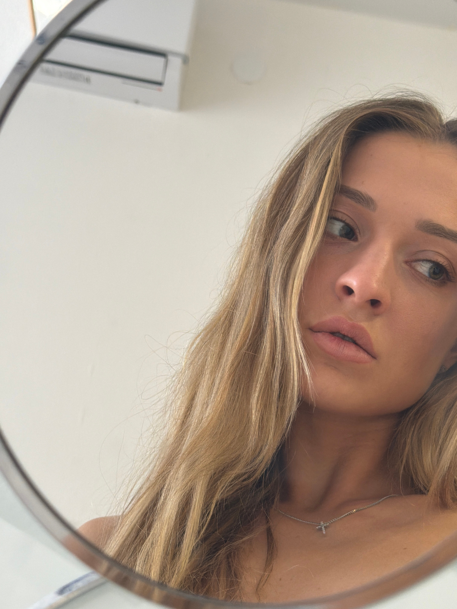 The image presents a close-up, angled view of a woman's face reflected in a round mirror. She has light skin, blonde hair with darker roots, and light-colored eyes. Her gaze is directed upwards and to…read more