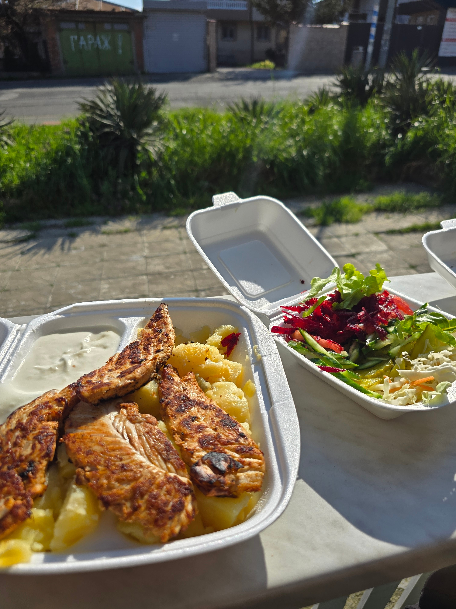 The image shows a takeout meal consisting of grilled chicken, boiled potatoes, tzatziki sauce, and a salad in white styrofoam containers. The meal is placed on a white surface, likely a table. In the…read more