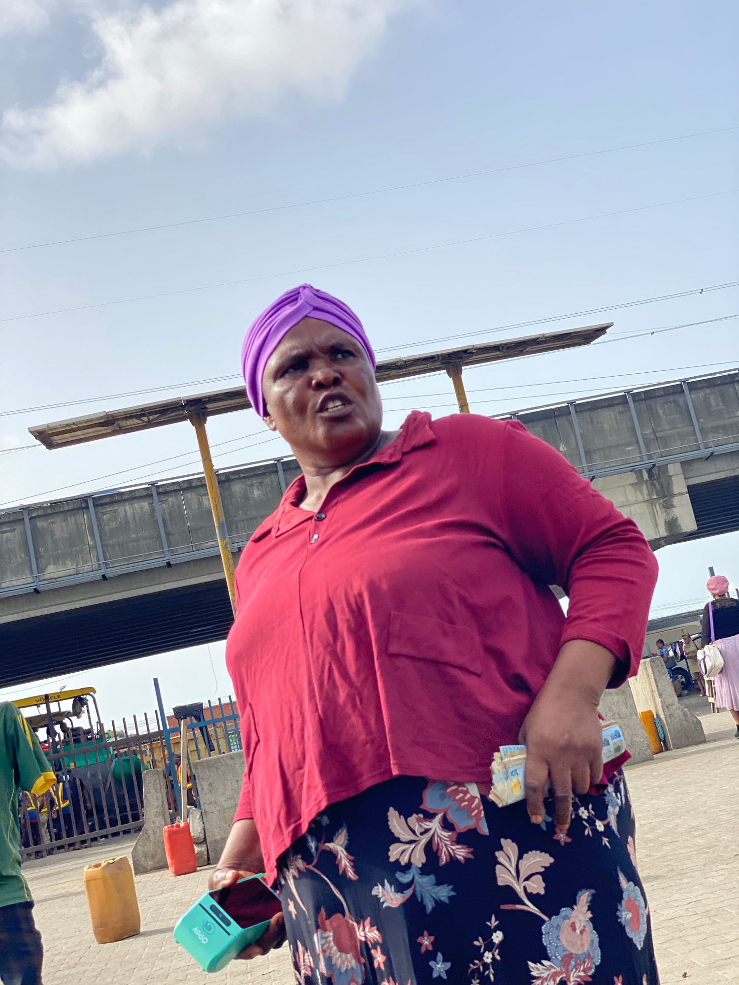 A woman wearing a purple headwrap and a dark red shirt with a floral-patterned skirt stands outside in Ado, Nigeria. She is holding a stack of banknotes in her left hand and a light blue Opay device i…read more