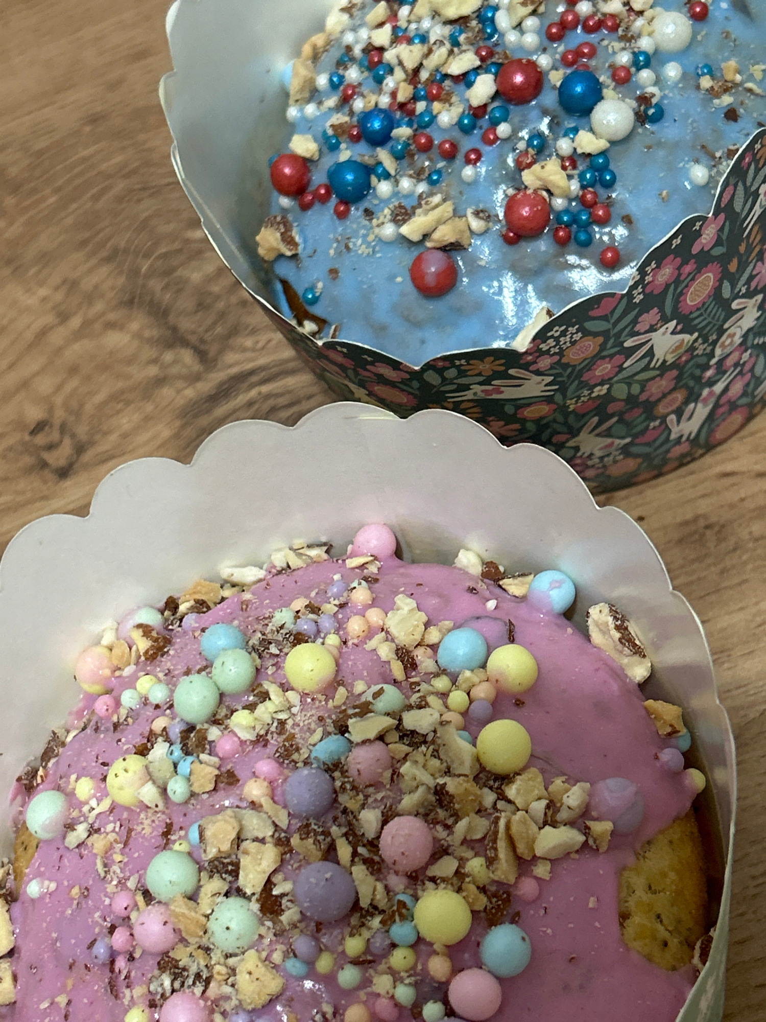 Two Easter cakes are displayed on a wooden surface. The cake on the left has blue icing with red, white, and blue sprinkles and chopped nuts. It is contained in a paper wrapper with a dark floral patt…read more