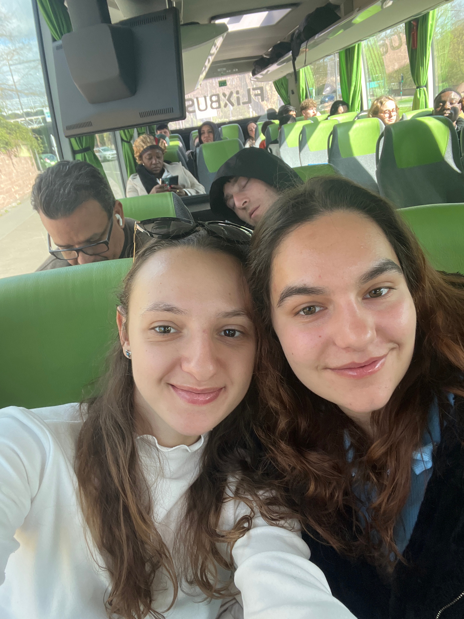 Two young women are posing for a selfie. They are seated in a vehicle, likely a bus, with other passengers visible in the background. The interior of the vehicle has green seating. Outside the windows…read more