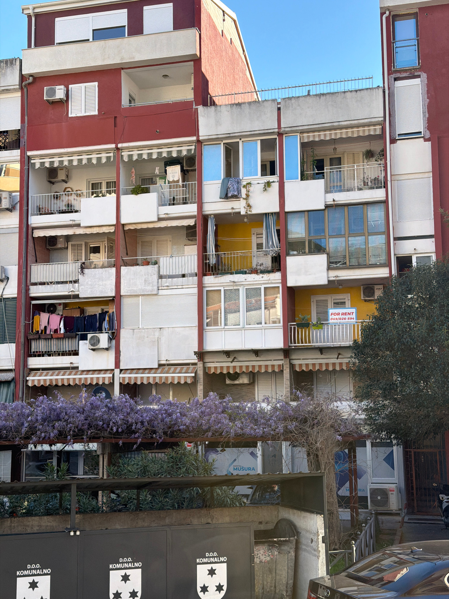The image shows a high-rise residential building, probably located in the city of Budva, Montenegro, given the writing in the image. The building features numerous apartments, each with a balcony. Man…read more
