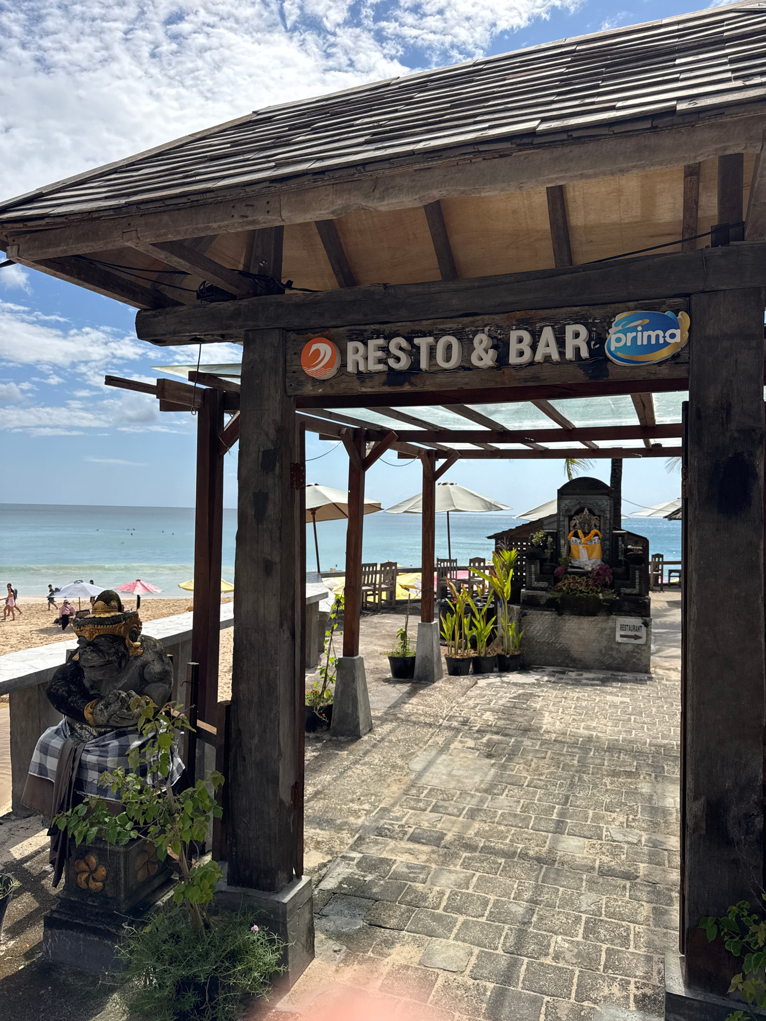 The image captures the entrance to a "RESTO & BAR" in Kuta Selatan, Indonesia. The entrance is framed by a wooden structure with a sign displaying the name and a "Prima" logo. Beyond the entrance, a sā¦read more