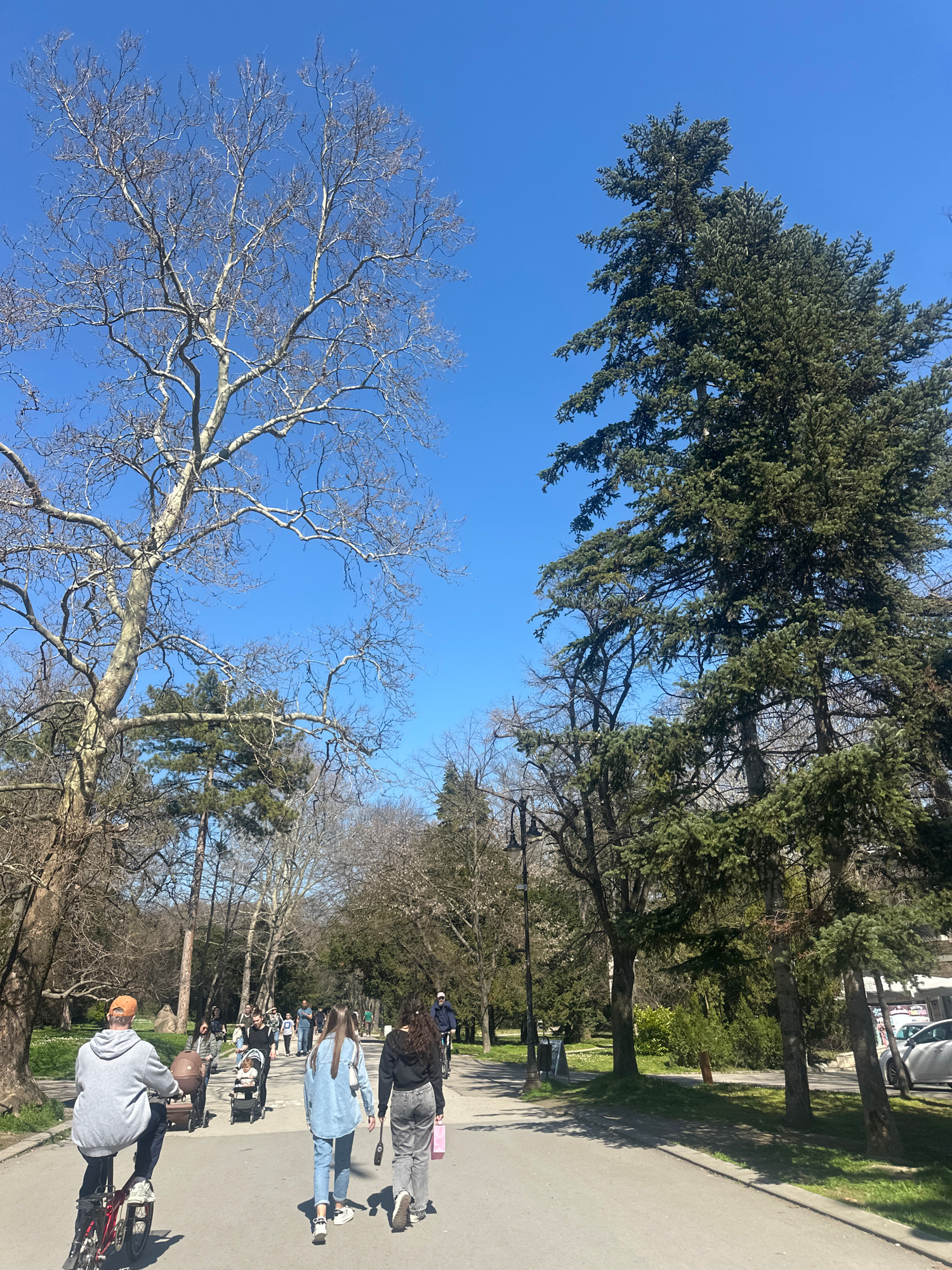 The image shows a pedestrian walkway in Varna, Bulgaria. On the right is a line of evergreen trees. On the left, a deciduous tree without leaves stretches its branches towards the blue sky. A paved wa…read more