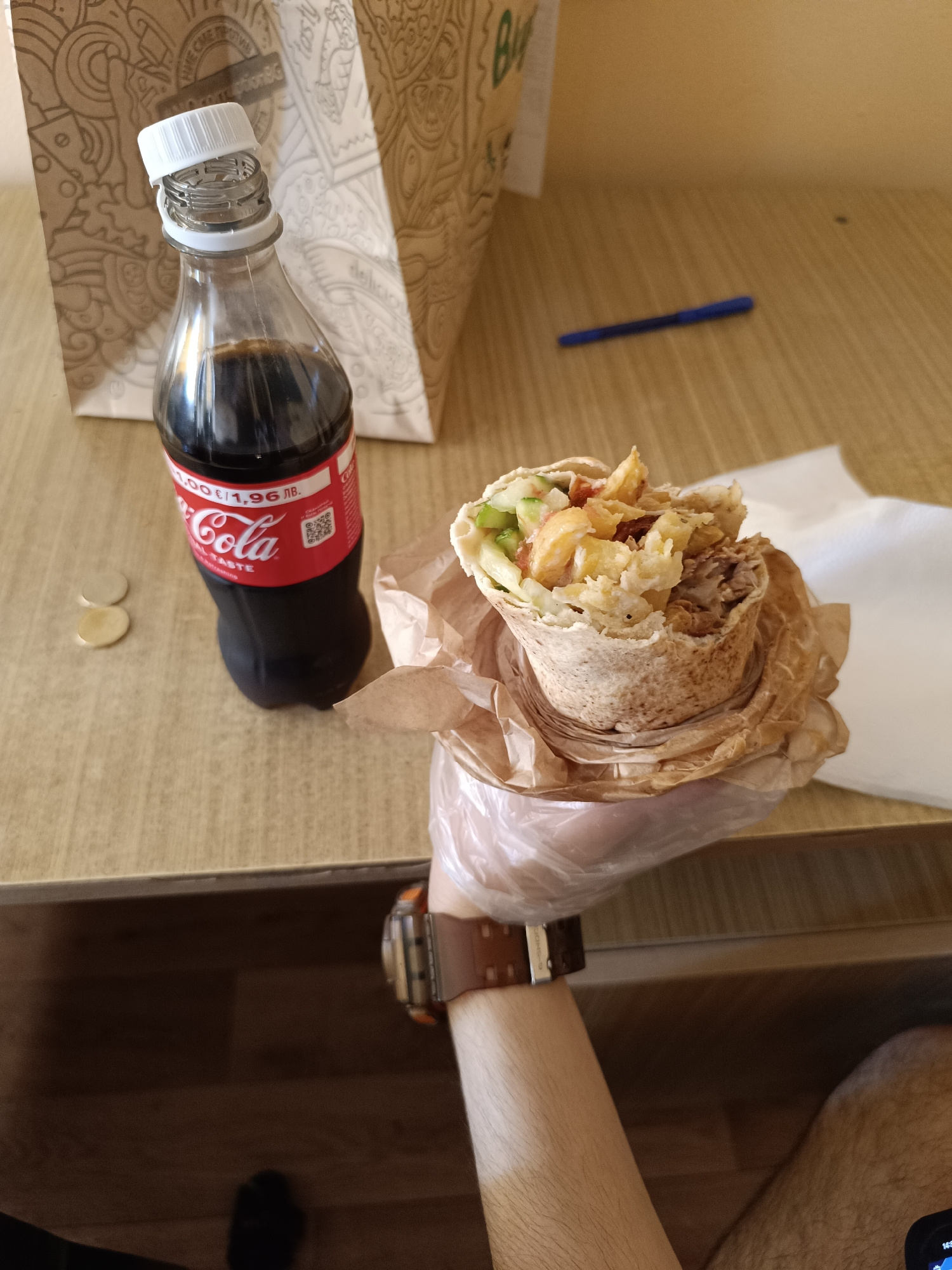 The image depicts a person seated at a light-colored wooden table. The person's left arm is visible, with a G-Shock watch. The person is holding a shawarma in a plastic-gloved hand. On the table is a…read more