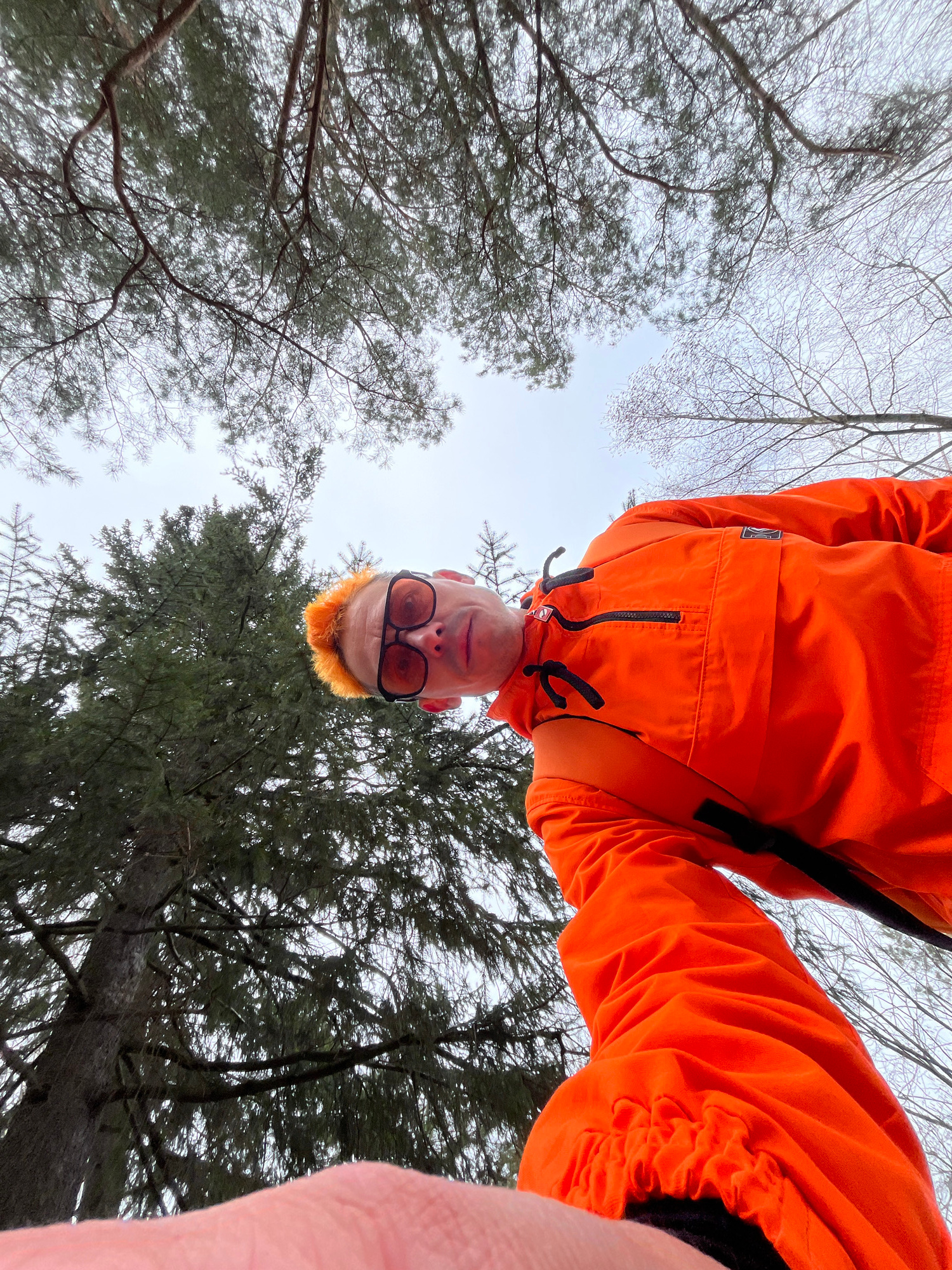 An upward-angle photograph captures a person in a forest setting, looking down towards the camera. The subject, likely male, wears a bright orange anorak or jacket with black details, including zipper…read more