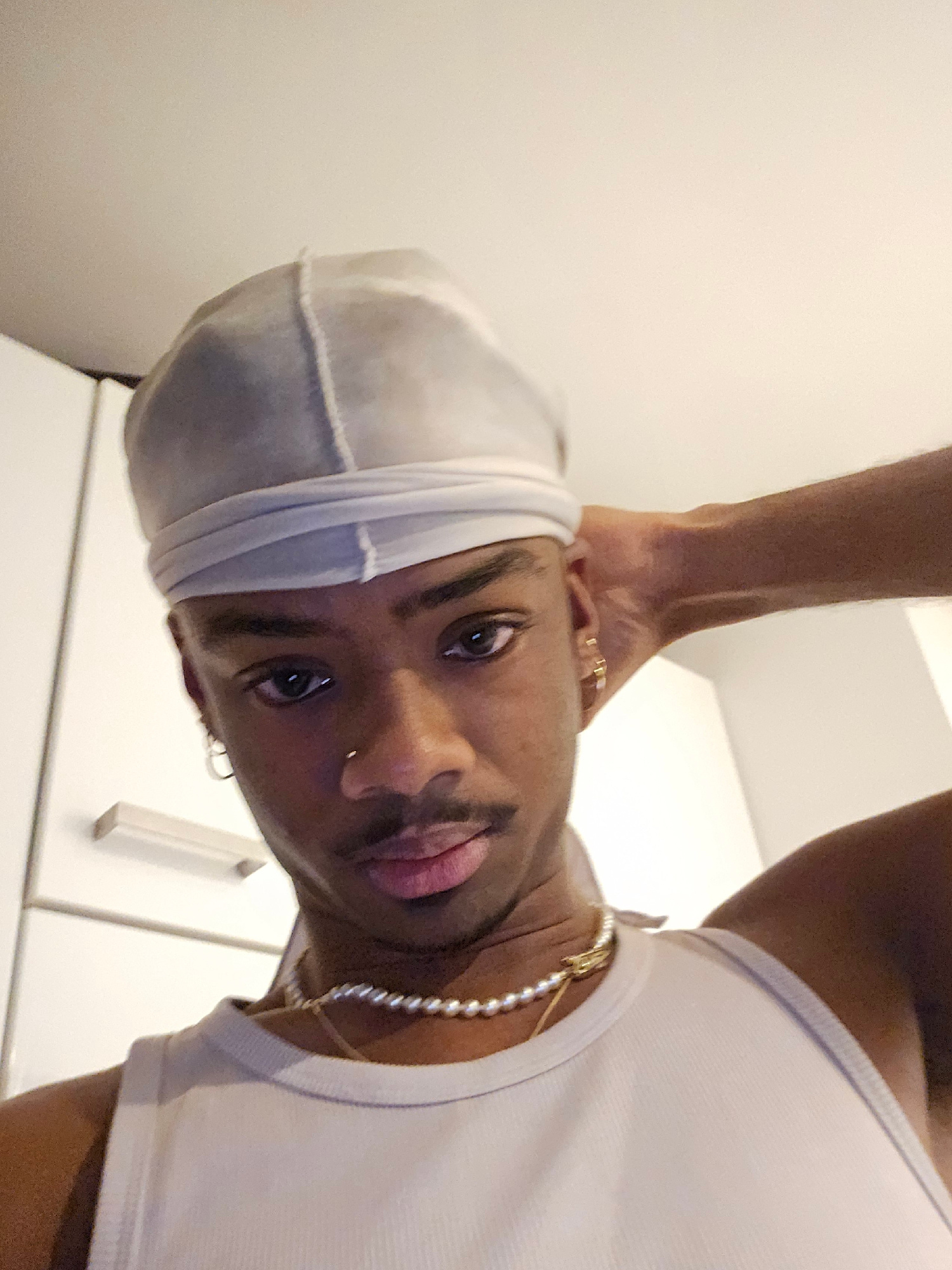 A portrait of a Black person wearing a white tank top, a pearl necklace with a gold charm, and a white durag. The person has a nose ring, is wearing earrings, and is holding their face with one hand.…read more