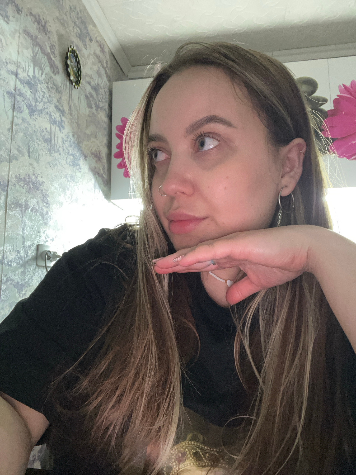 A young woman with light brown hair and blue eyes is posing for a selfie indoors. She is wearing a black shirt and has a silver hoop earring in her left ear, as well as a nose ring on her left nostrilβ¦read more
