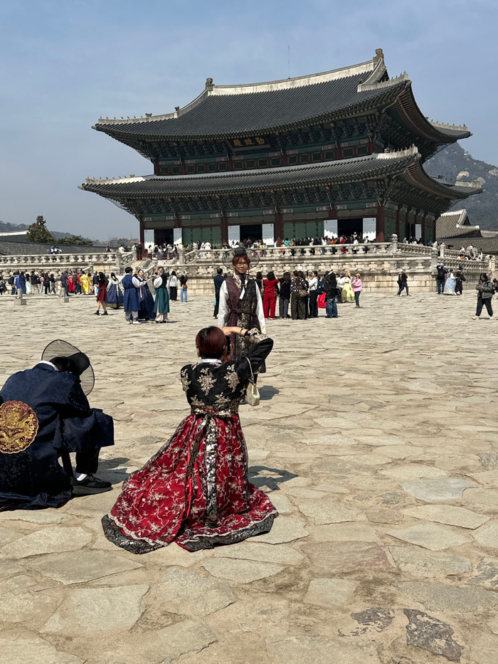 The image depicts an outdoor scene within the Gyeongbokgung Palace complex in Seoul, South Korea, with the prominent Geunjeongjeon Hall in the background. The day is clear and sunny with a blue sky.…read more