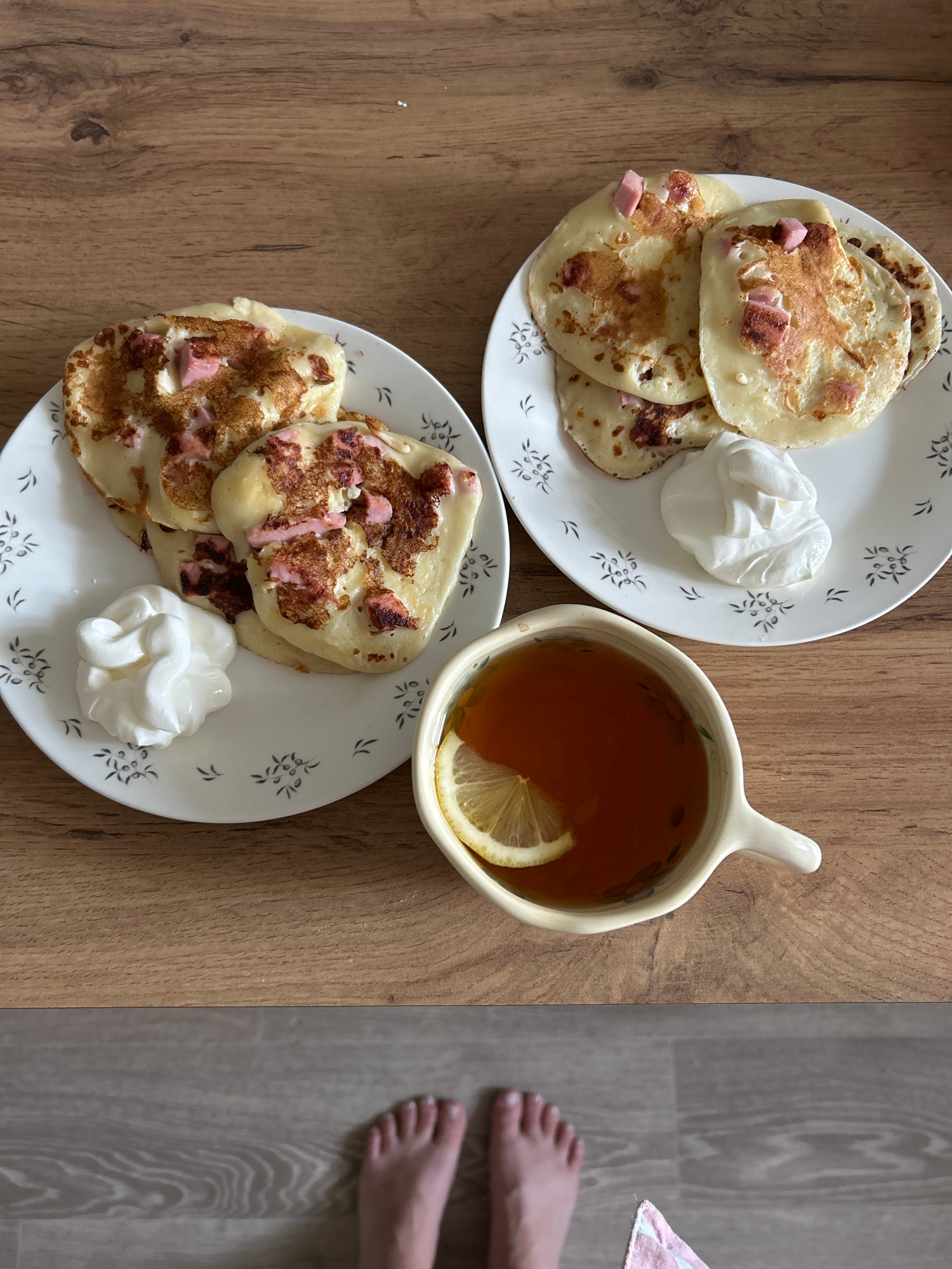 The image shows a still life composition on a wooden surface. Two white plates, each containing three pancakes dotted with small pieces of ham, sit alongside a dollop of whipped cream. A mug of tea wi…read more