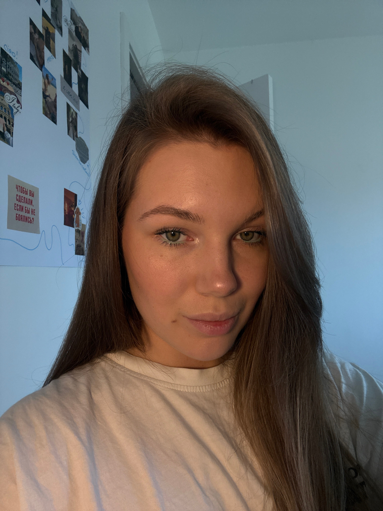 A selfie of a young woman with long brown hair and green eyes, wearing a white t-shirt. Behind her is a white wall decorated with photos and handwritten notes. Some visible words include "Ciao!", "Ita…read more