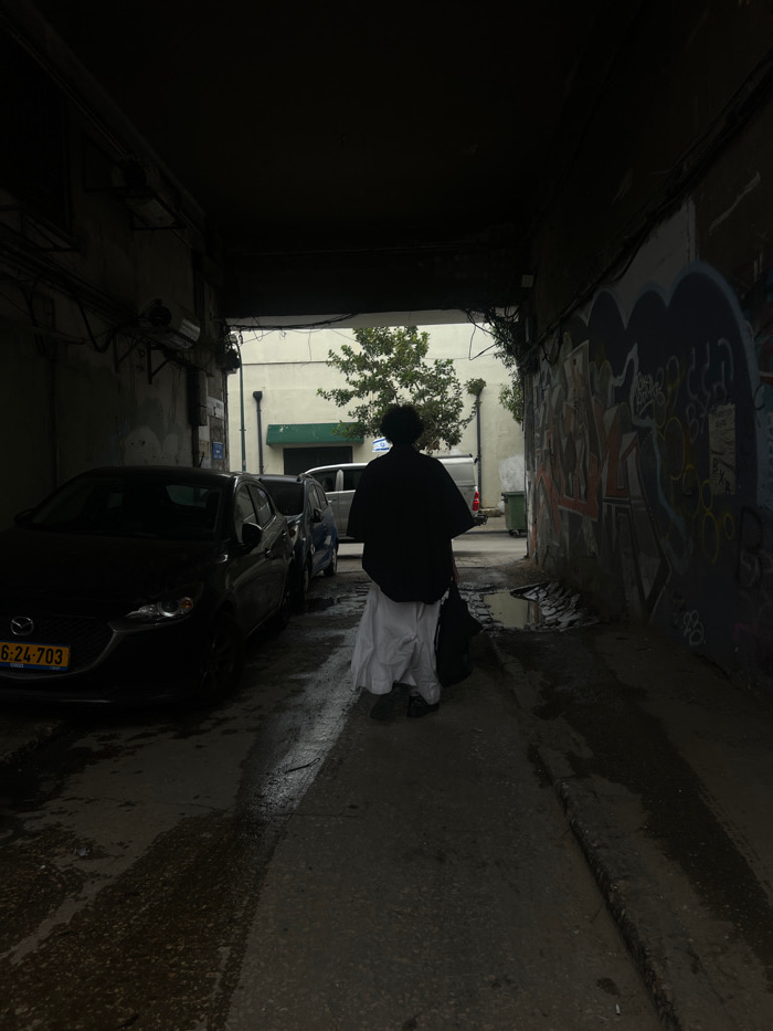 The image shows a dimly lit urban passageway in Tel-Aviv, Israel, viewed from within, looking towards a brighter exit. A single person, seen from behind, walks away from the viewer towards the illuminβ¦read more