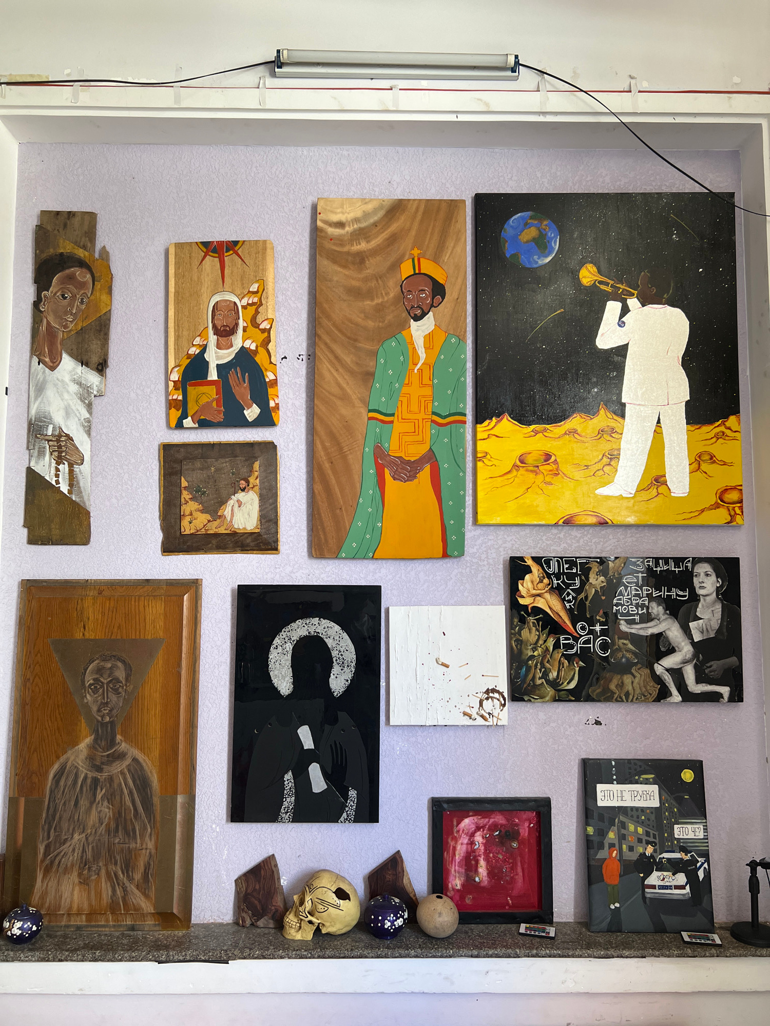 This image captures a wall and a display shelf laden with diverse artworks and decorative objects, likely within an art gallery or personal collection space in Nha Trang, Vietnam. The wall, featuring…read more
