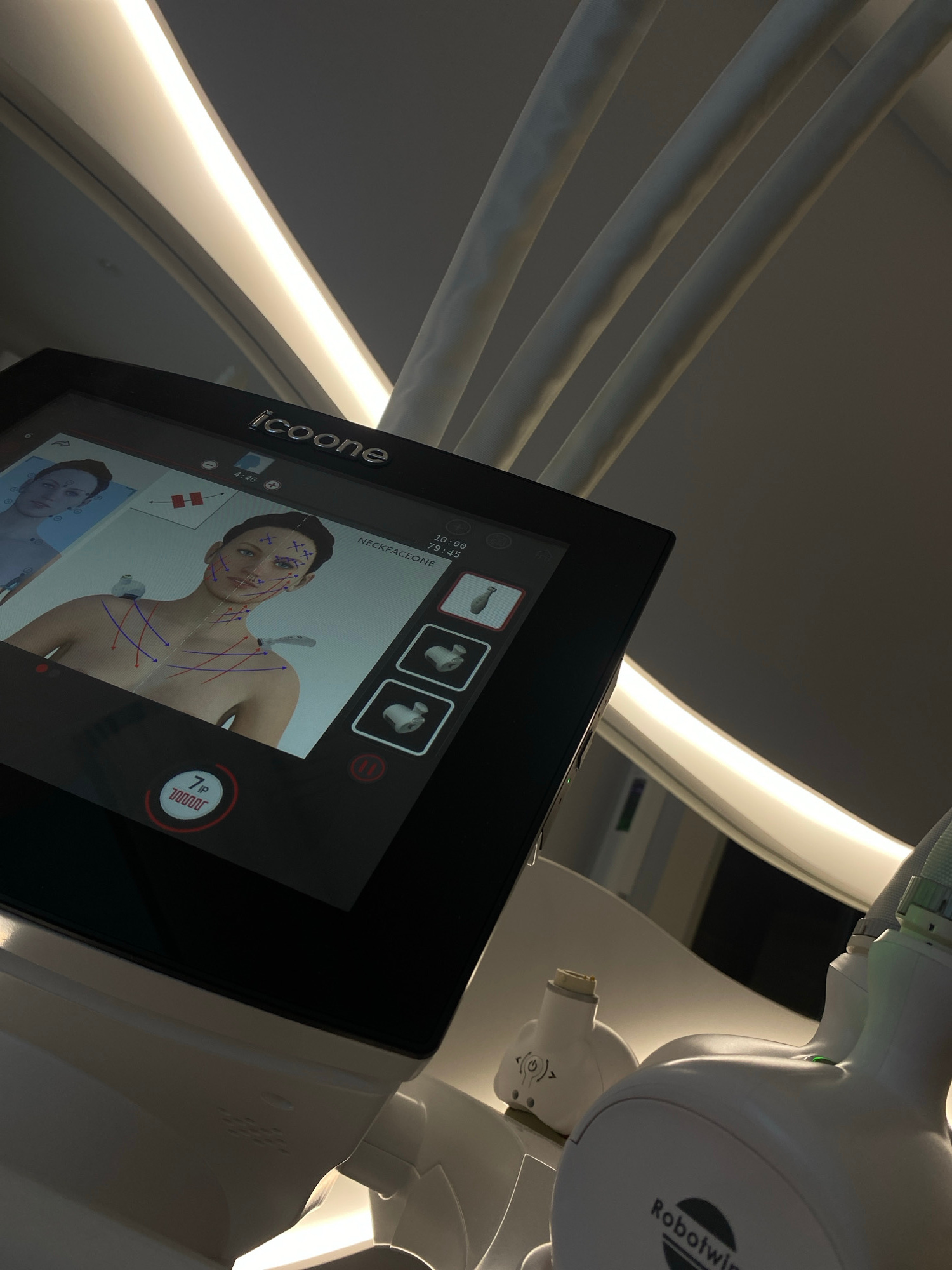 The image shows a close-up of a medical device, specifically a "icoone" machine, featuring a touchscreen display with a human face depicted with graphical overlays of lines and arrows, presumably for…read more