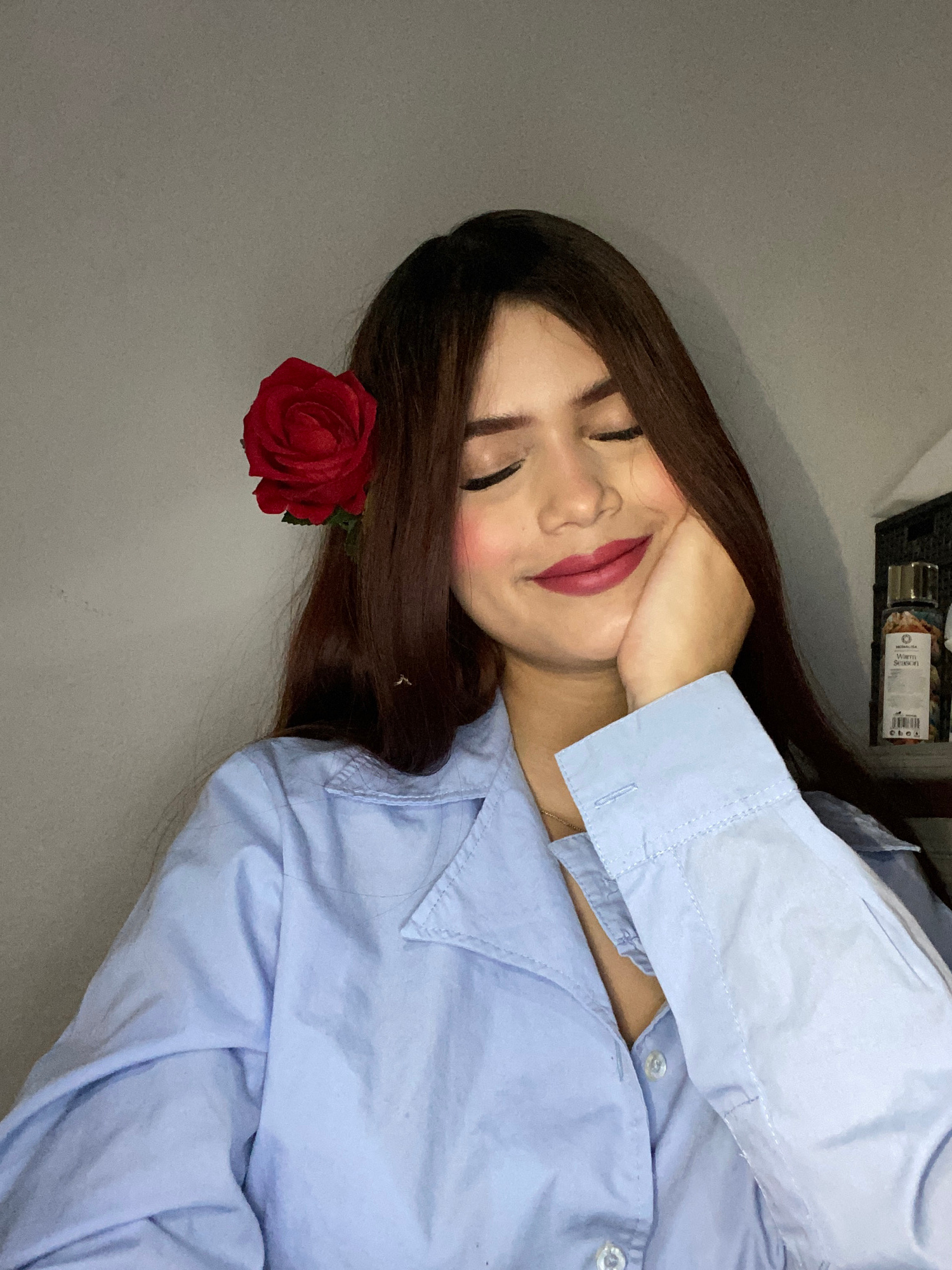 The image shows a woman with long brown hair wearing a light blue button-down shirt. She has a red rose in her hair near her ear. Her eyes are closed, and she is smiling slightly with her hand against…read more