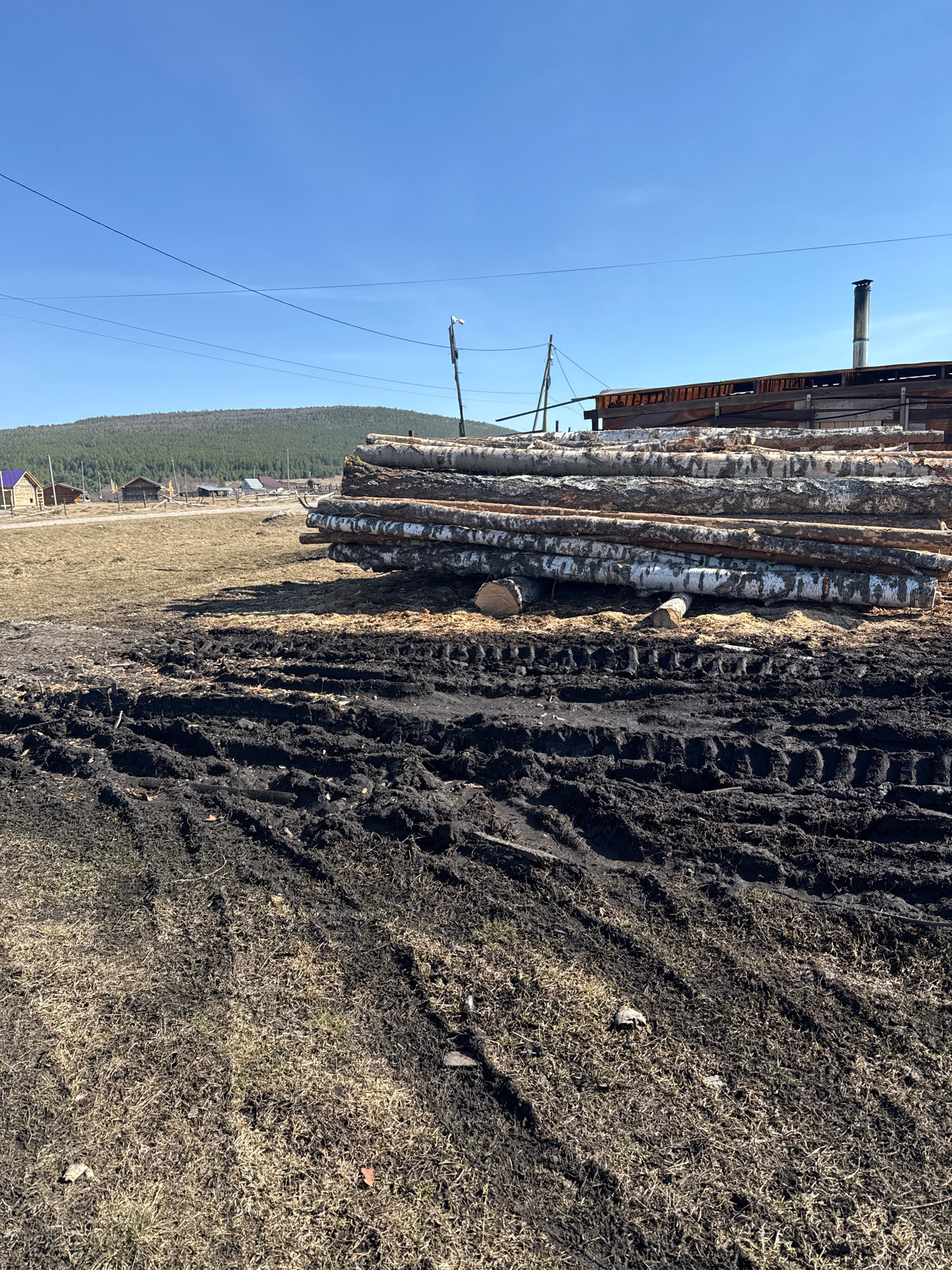 The scene depicts a stack of birch logs near Tyulyuk, Russia, lying alongside tire tracks in the mud. Behind the logs, there's a building with a chimney. Further back, a field transitions into a fores…read more