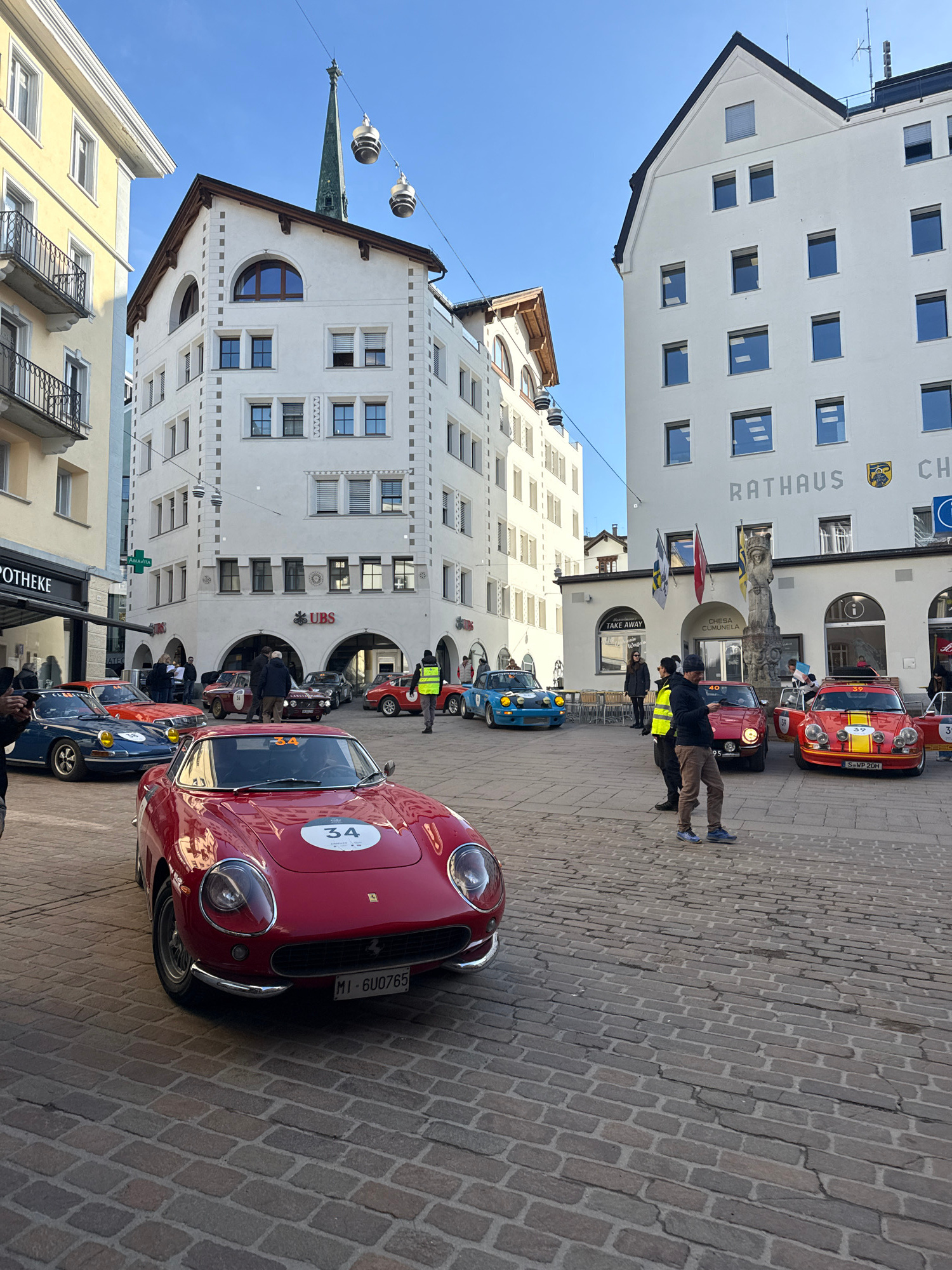 The image depicts a vibrant outdoor scene in Sankt Moritz, Switzerland, specifically a cobblestone town square surrounded by multi-story European-style buildings under a clear blue sky. In the immediβ¦read more
