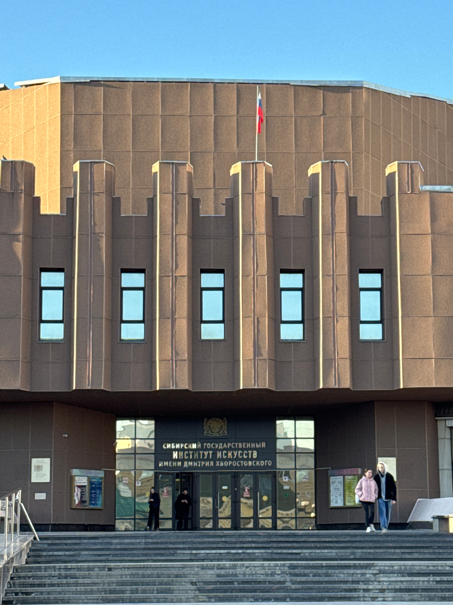The image shows a building facade in Krasnoyarsk, Russia. The structure is brown, rectangularly sectioned, and punctuated by rows of rectangular windows. A flag is visible towards the top left. To the…read more