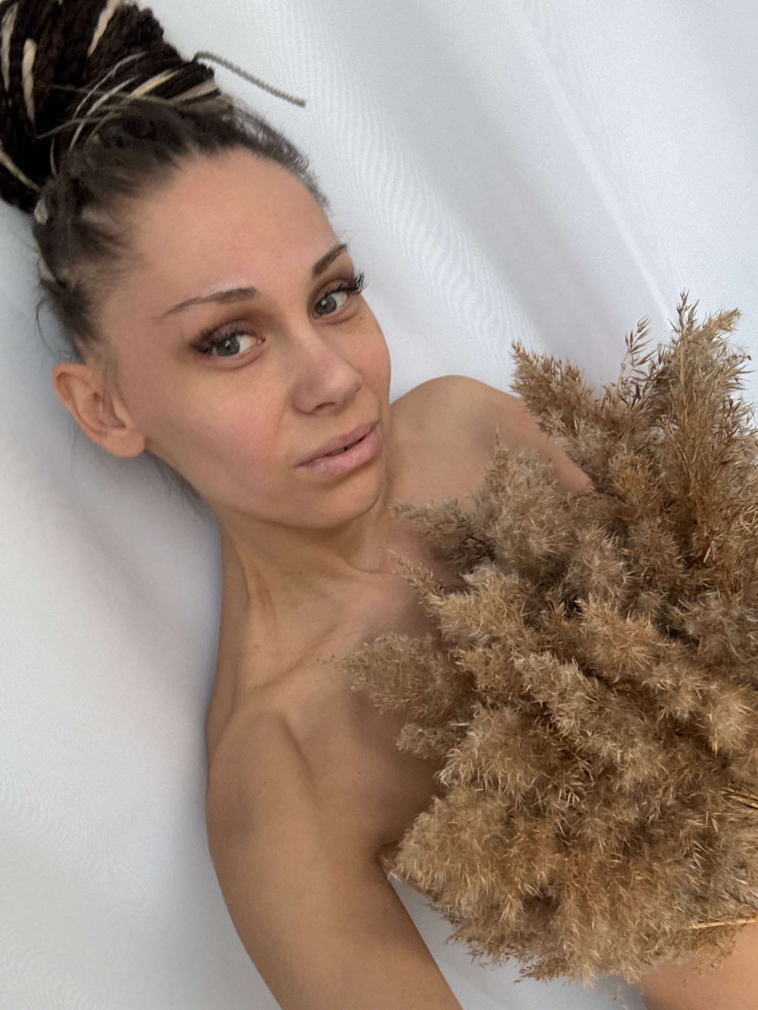 A woman with braided hair lies on a white surface. She is holding a bunch of dried grass or wheat stalks over her chest. Her head is tilted towards the left, and she is looking towards the camera. Theβ¦read more