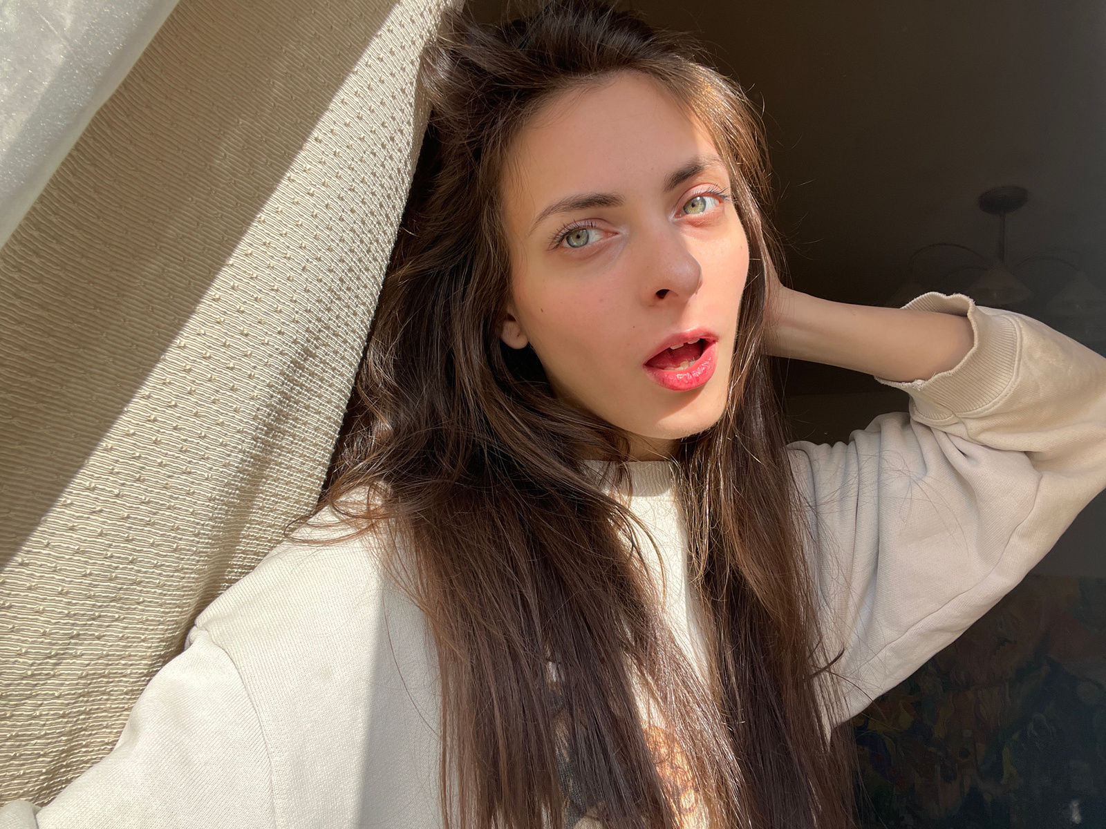 A fair-skinned woman with long brown hair lies on an upholstered, beige-colored object, possibly a sofa or lounge chair. She wears a light-colored sweater. Her head is tilted back, with her mouth slig…read more