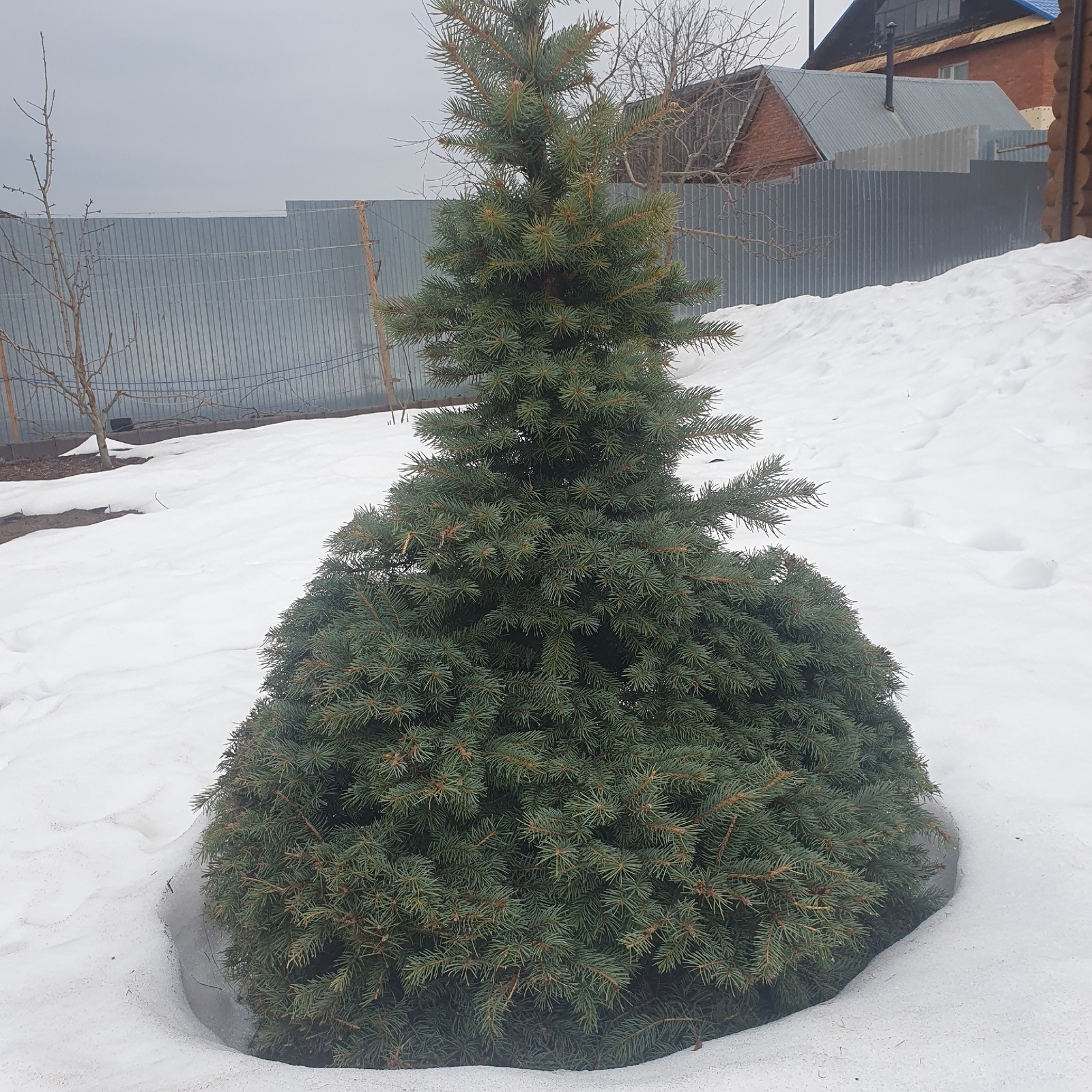 The image shows a small evergreen tree partially surrounded by snow. The tree is situated in what appears to be an outdoor area, with a building featuring corrugated metal siding visible in the backgr…read more