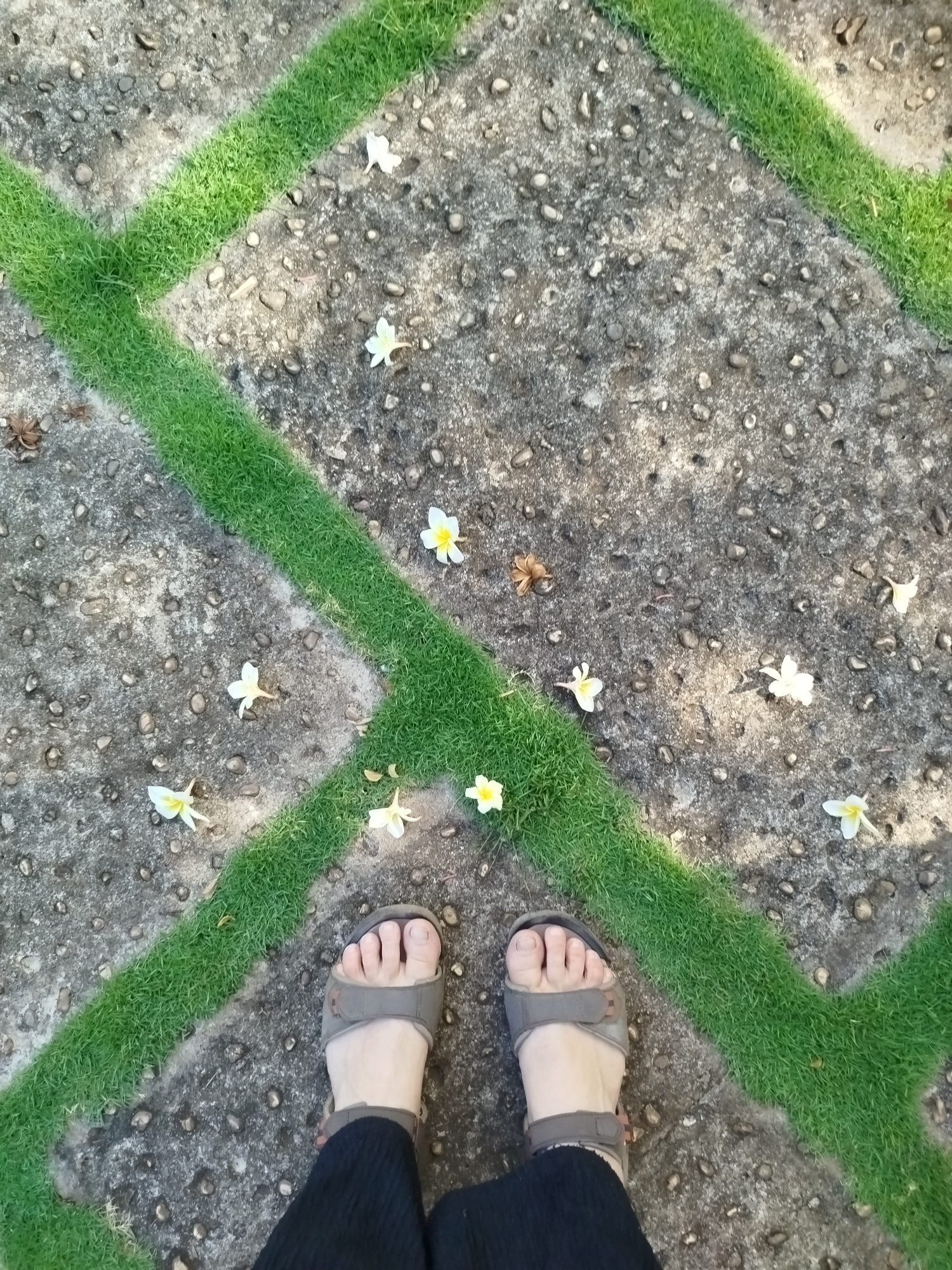 A high-angle shot shows two bare feet wearing gray sandals on a concrete surface patterned with diamond shapes outlined by green grass. Several small, scattered white flowers with yellow centers lie o…read more