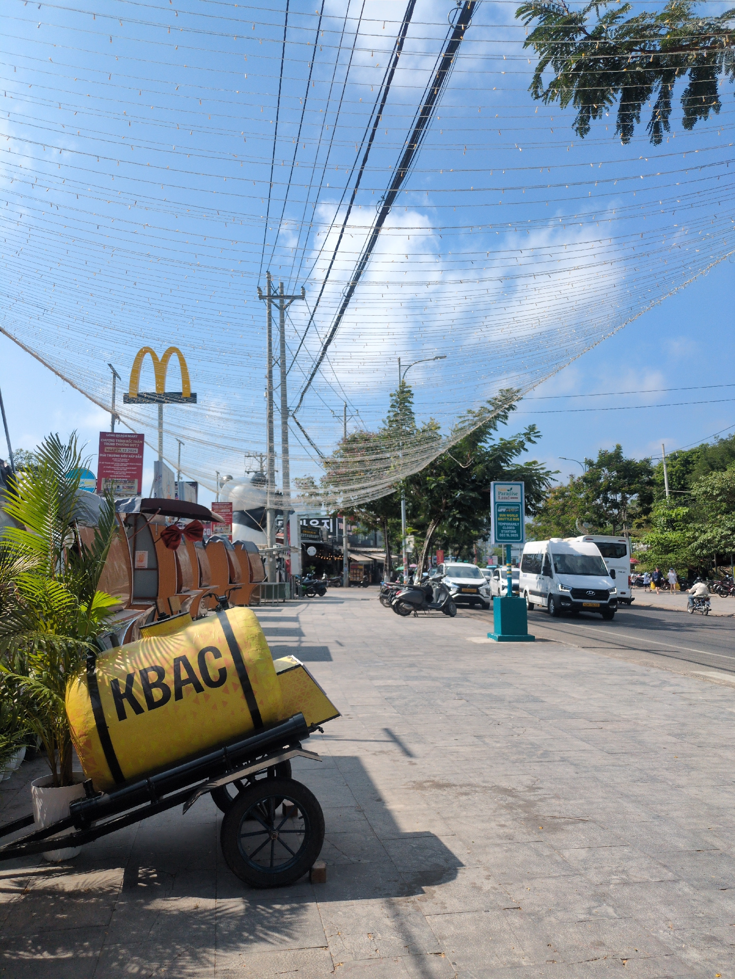 The image shows a street scene in Phú Quốc, Vietnam. The scene is on a sunny day. A yellow advertisement and a McDonald's sign are visible in the foreground. In the background, there is a street with…read more