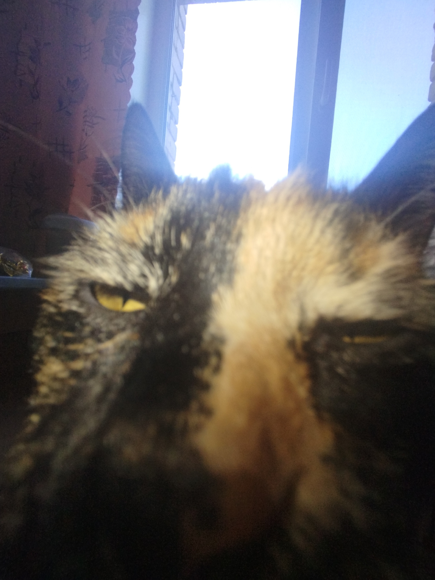 A close-up, slightly blurred photograph shows the face of a tortoiseshell cat. The cat's eyes are partially closed, giving it a squinting expression. The cat's fur is a mix of black, brown, and tan co…read more