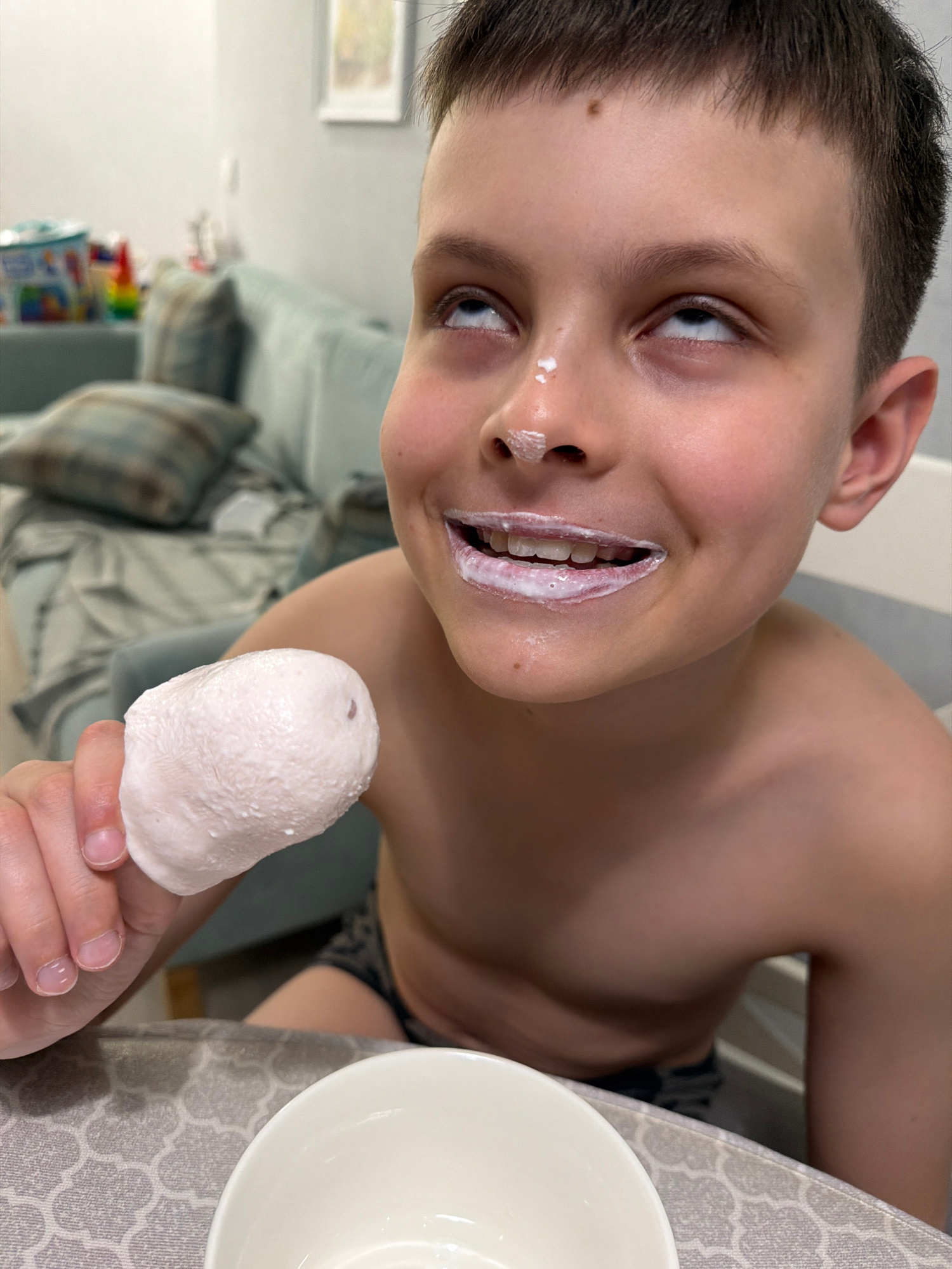 A boy with short brown hair and light skin is holding a white, dome-shaped item, possibly food, in his hand. He has white substance on his lips and nose. He is shirtless, and the lower part of his bod…read more