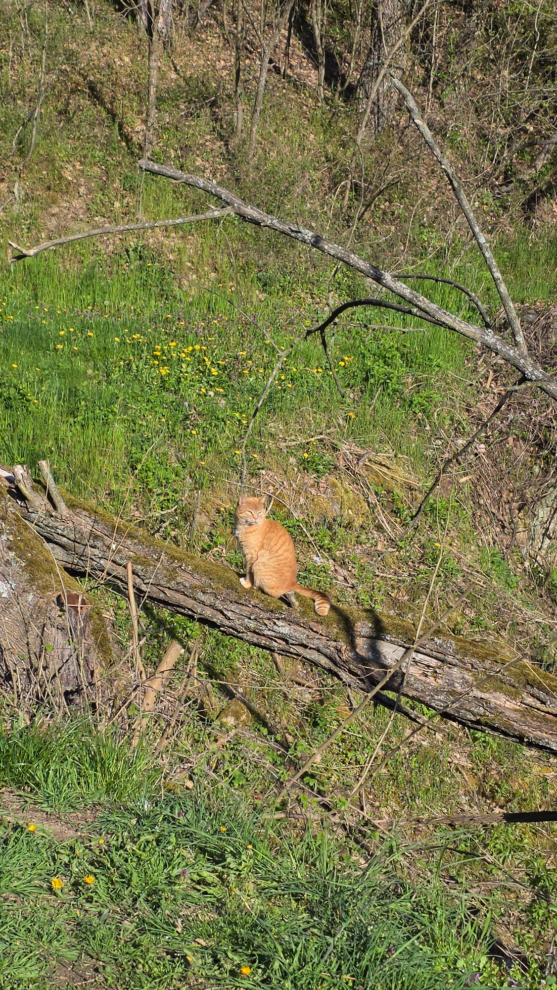 An image shows an orange tabby cat on a tree trunk in a grassy area. The location is in a wooded area, likely a park or natural space, with grass and dandelions, possibly near or in Blagoevgrad, Bulga…read more