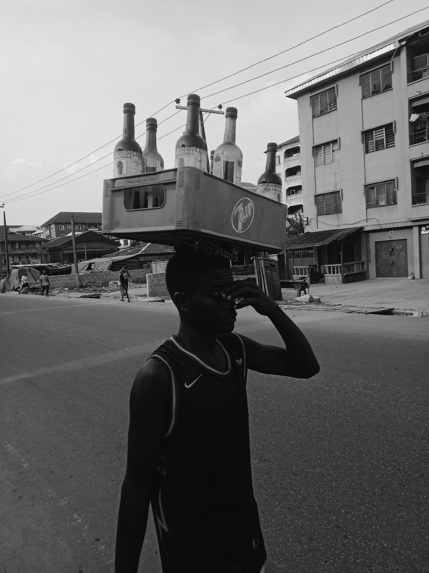 A black and white photograph depicts a man in Fegge, Nigeria, carrying a crate of bottled beverages on his head. The man is wearing a tank top. The crate is filled with bottles labeled "MEDICEN ALCOHO…read more