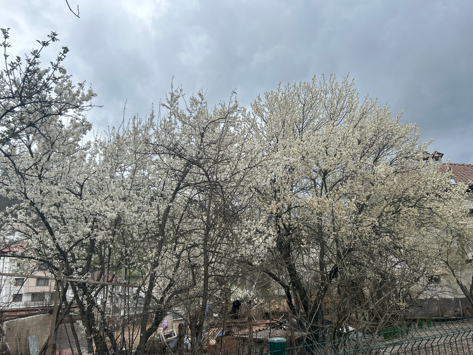 The image shows a cloudy sky above several trees in full white blossom. The trees are situated within a cluttered urban landscape, with fences, buildings, and other structures visible in the backgroun…read more