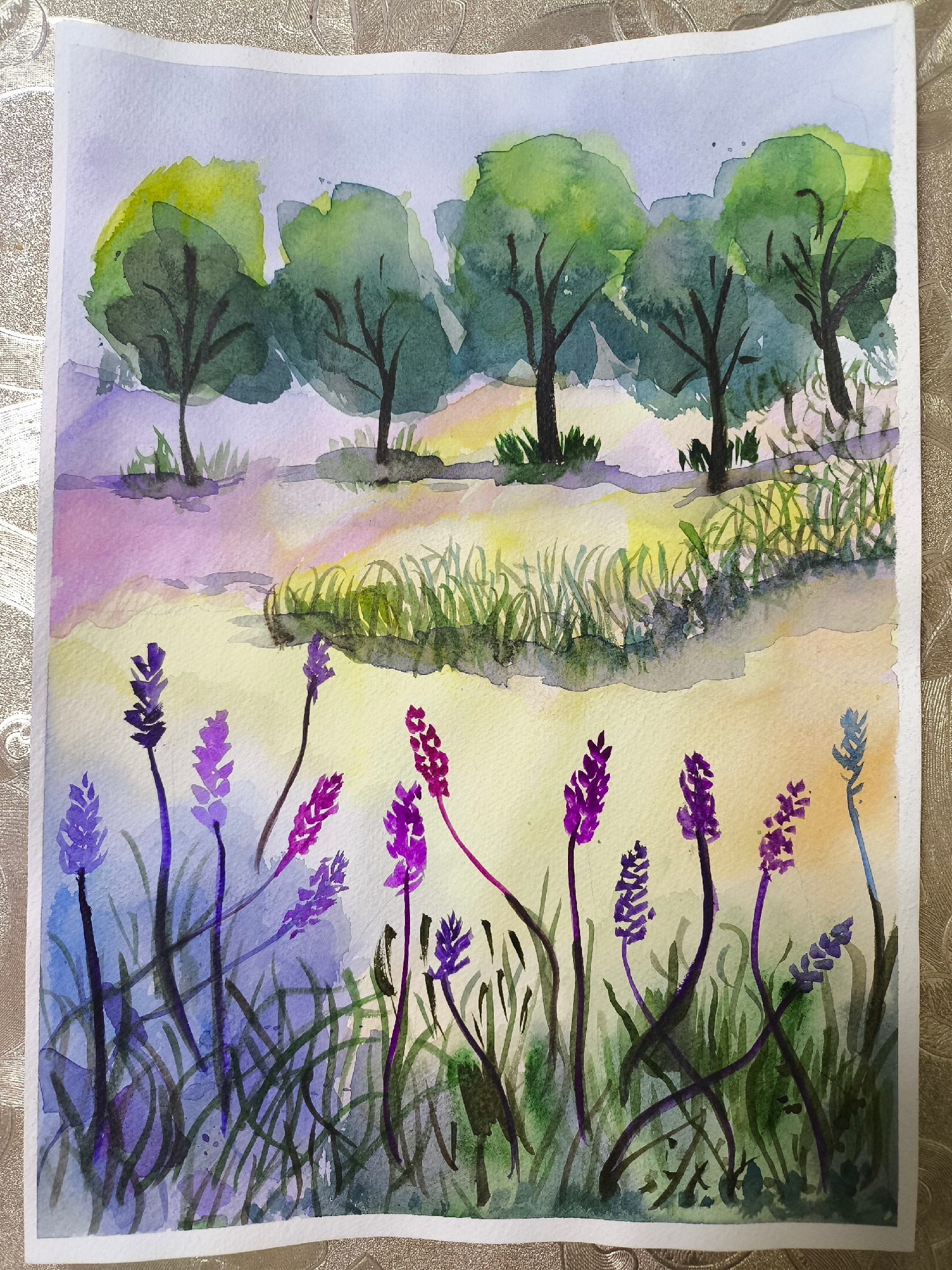 The image is a watercolor painting depicting a landscape with trees and lavender. In the background, there is a row of five trees with green foliage and dark trunks. The trees are situated on a sligh…read more