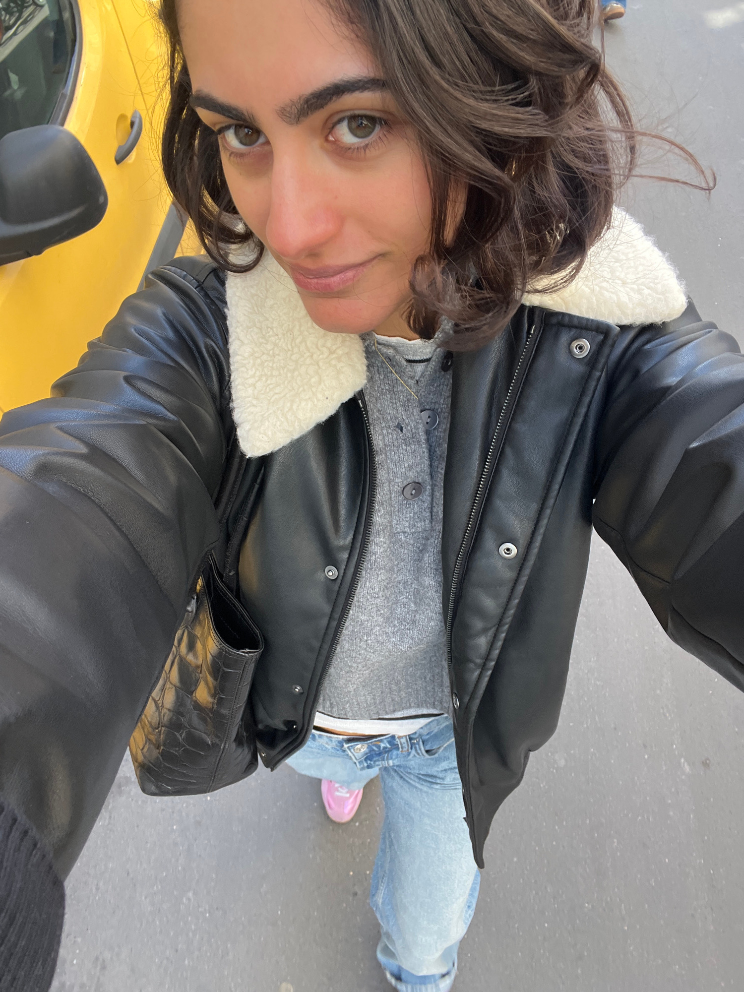 A woman with dark hair is taking a selfie outdoors. She is wearing a black leather jacket with a white shearling collar over a gray sweater and light blue jeans. She has a black handbag on her shouldeβ¦read more