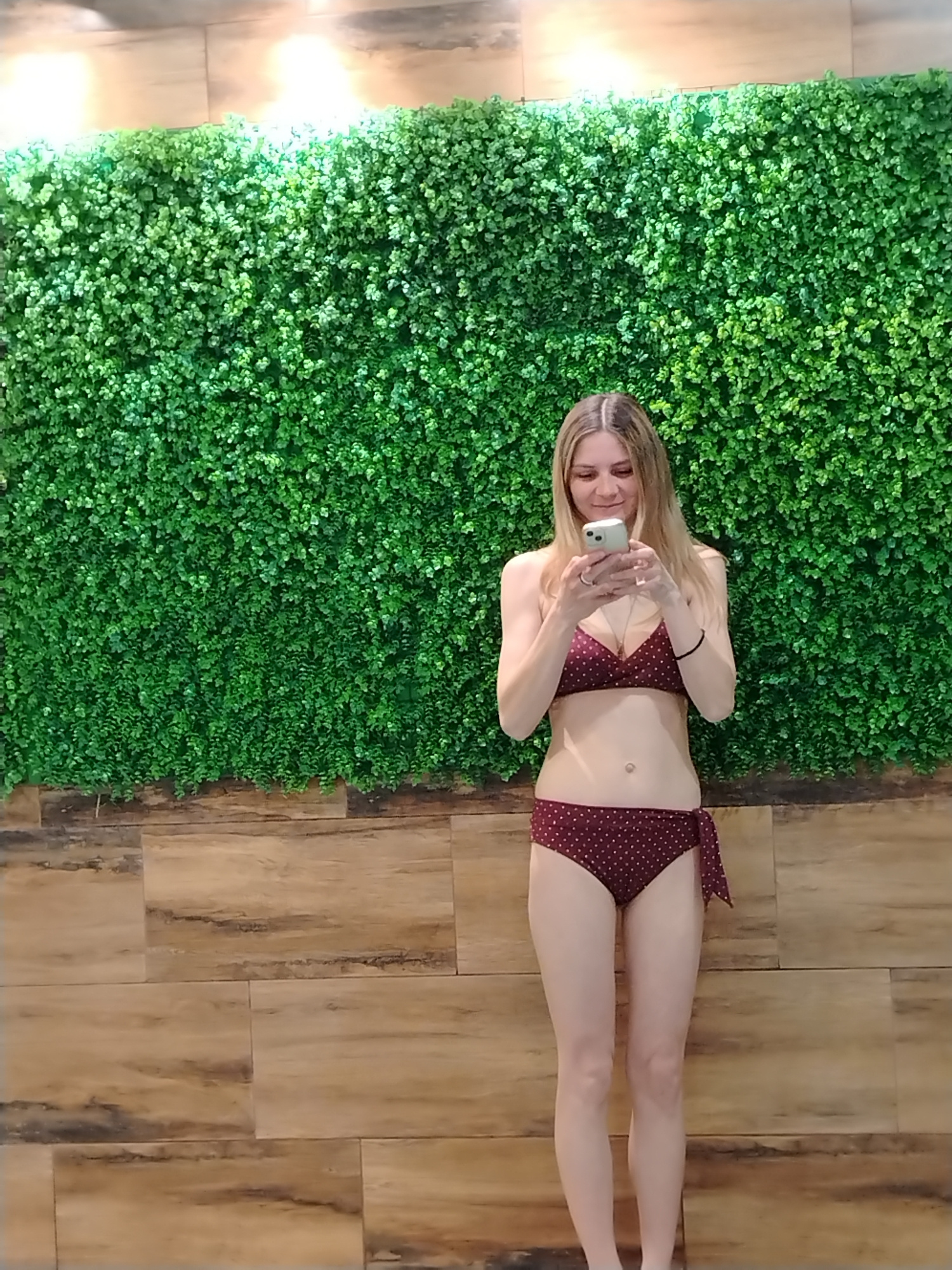 A woman stands in front of a wall composed of artificial green plants above wood-like tiles. She is wearing a two-piece bikini with a burgundy and gold polka dot pattern and is holding a smartphone, lβ¦read more