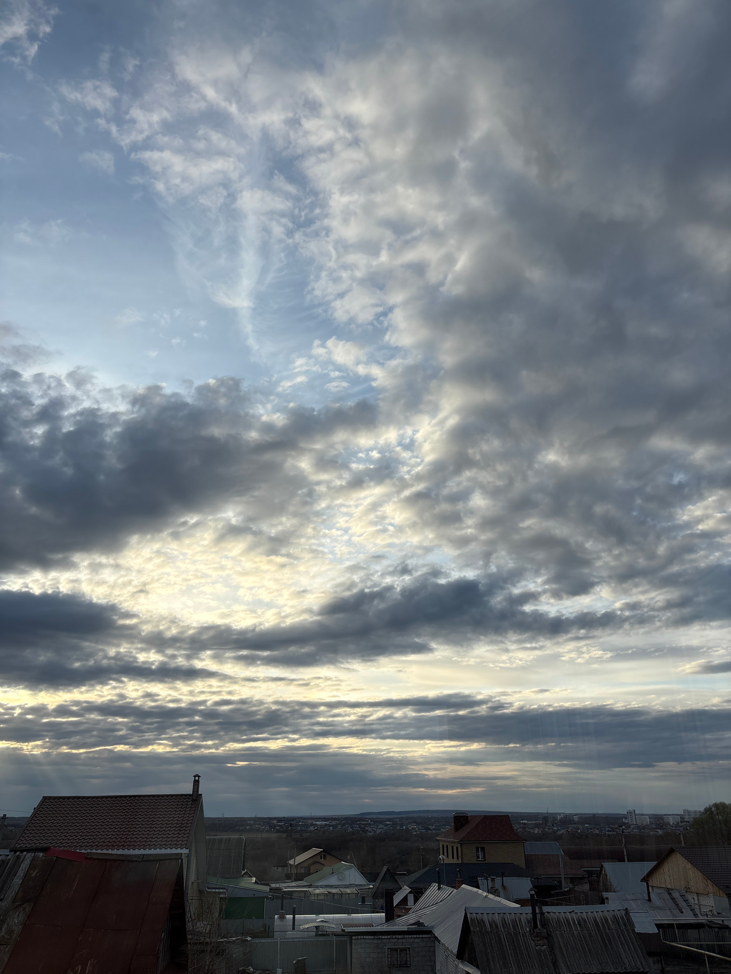 The image shows a view of Ulyanovsk, Russia, dominated by a dramatic sky. A mix of dark, heavy clouds and brighter, sunlit clouds stretch across the majority of the frame. In the lower portion of the…read more