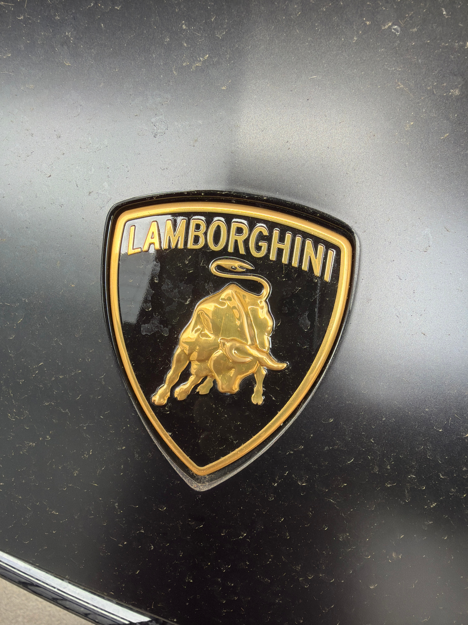 A close-up, high-angle shot captures a Lamborghini emblem set against a dark, matte surface, likely a car body panel. The emblem is shield-shaped, featuring a glossy black background bordered by a ref…read more