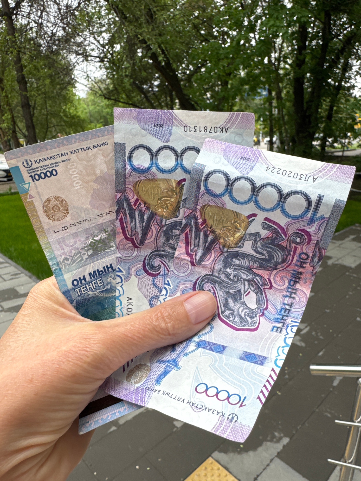 A hand holds three 10,000 Kazakhstani Tenge banknotes in an outdoor setting. The banknotes feature the number 10000 and the words "ОН МЫҢ ТЕҢГЕ" (Ten Thousand Tenge) in Kazakh, along with the name of…read more