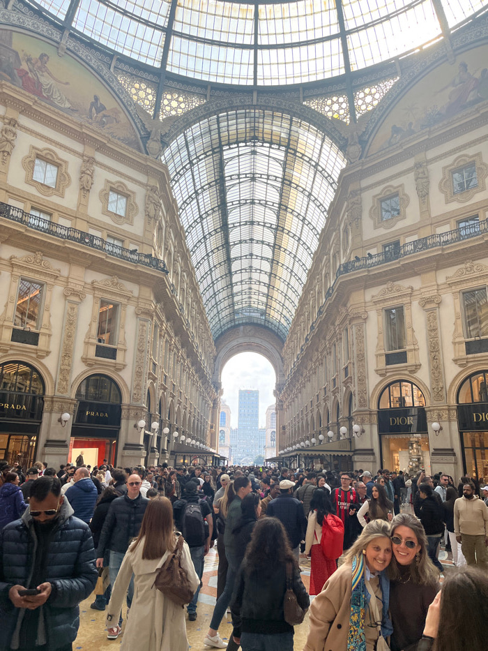 The image displays a crowded interior view of the Galleria Vittorio Emanuele II in Milan, Italy. The grand 19th-century shopping arcade is characterized by its high, vaulted glass and iron roof struct…read more