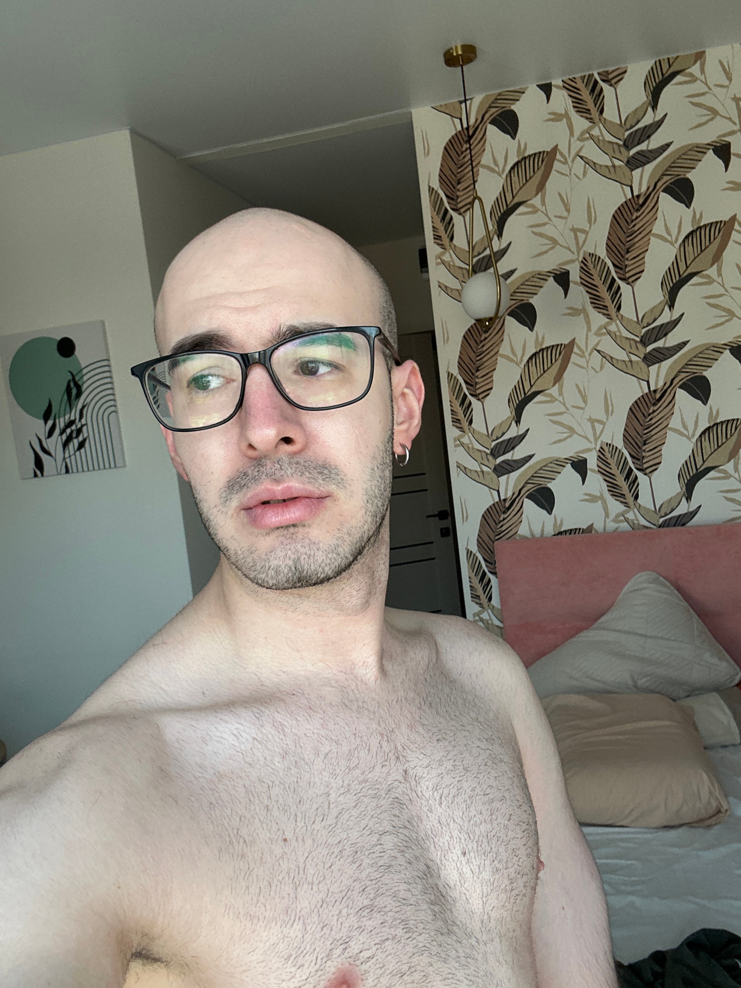 A close-up, angled self-portrait of a bald man with glasses and a short beard. He is shirtless and appears to be lying in bed. The background includes patterned wallpaper, pillows, a painting, and a l…read more